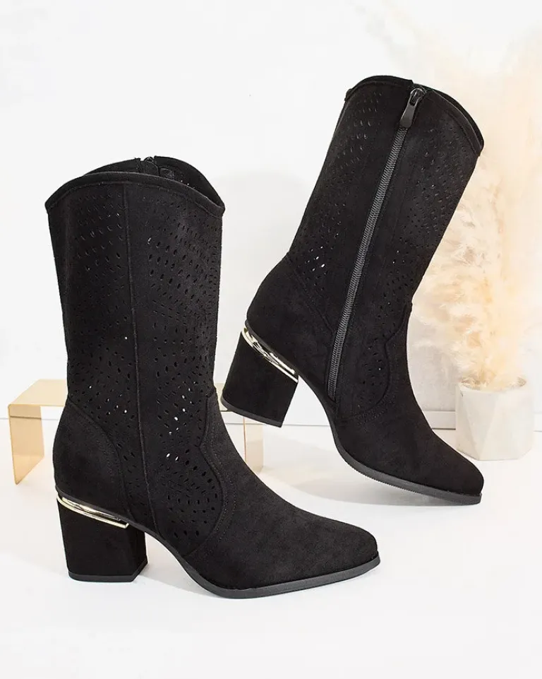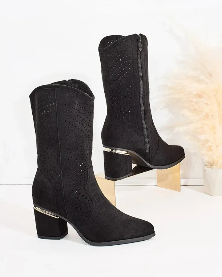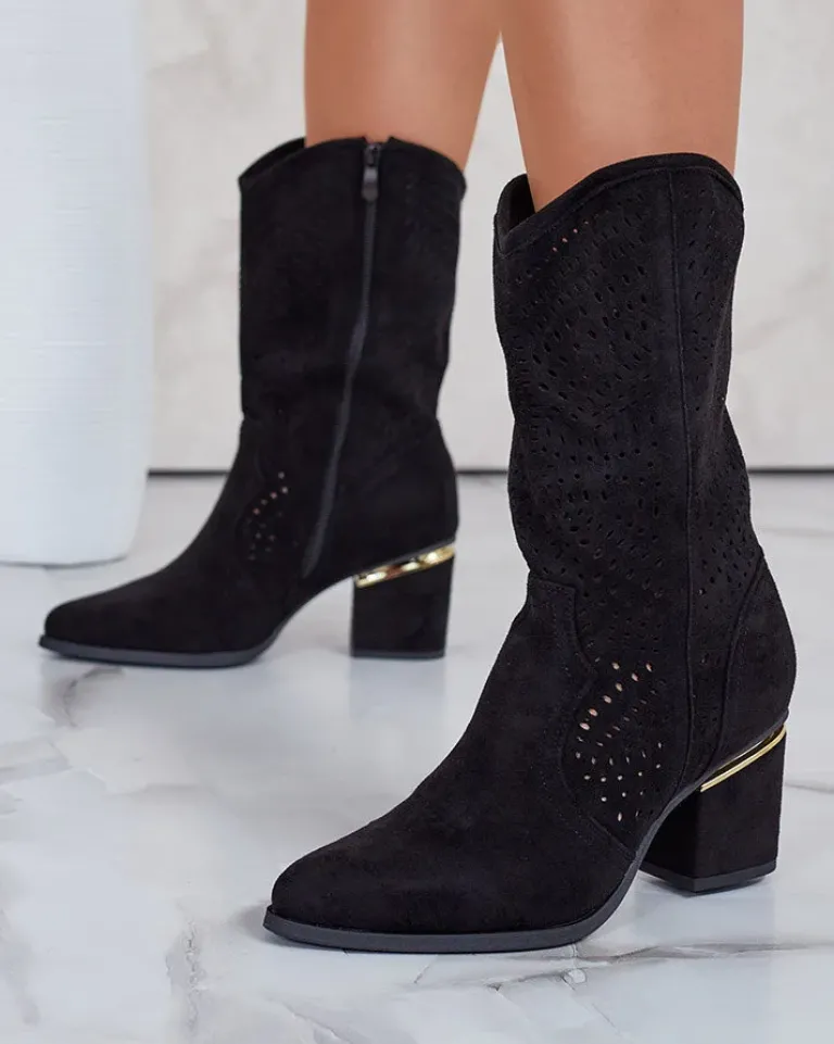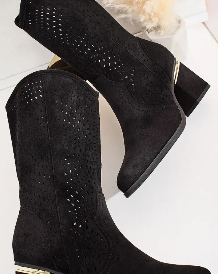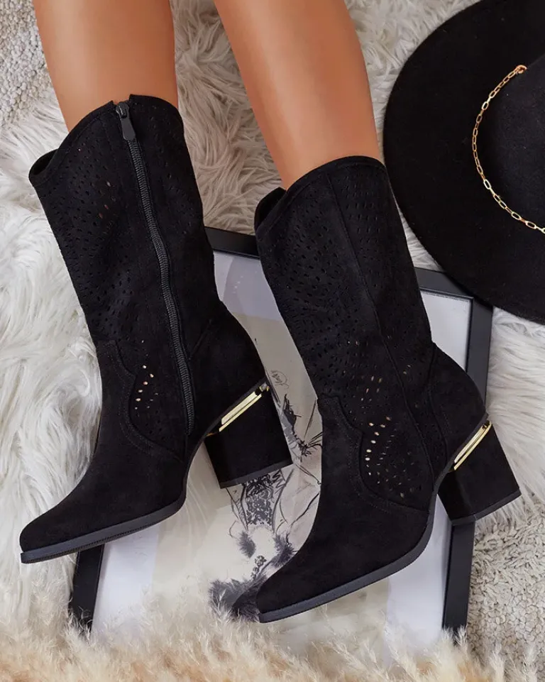 - Botki a’la kowbojki do połowy łydki na słupku, wykonane ze skóry ekologicznej zamszowej z ażurowym wykończeniem. Wkładka jest wykonana z eko skóry, buty na suwak. Pasują do wielu kobiecych stylizacji!