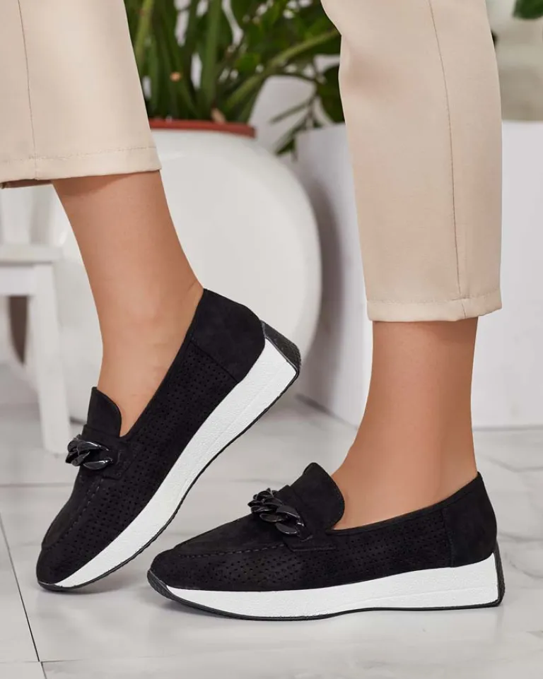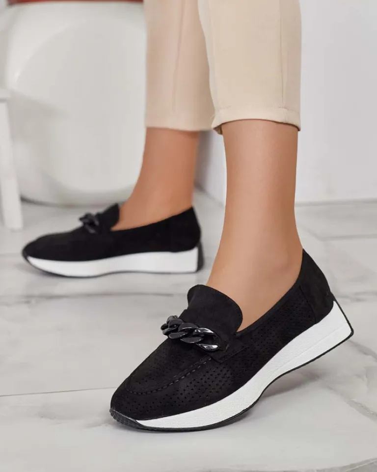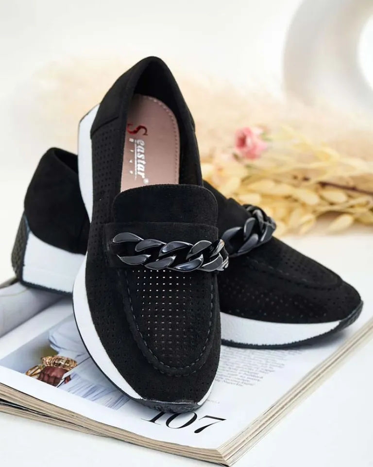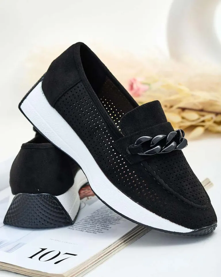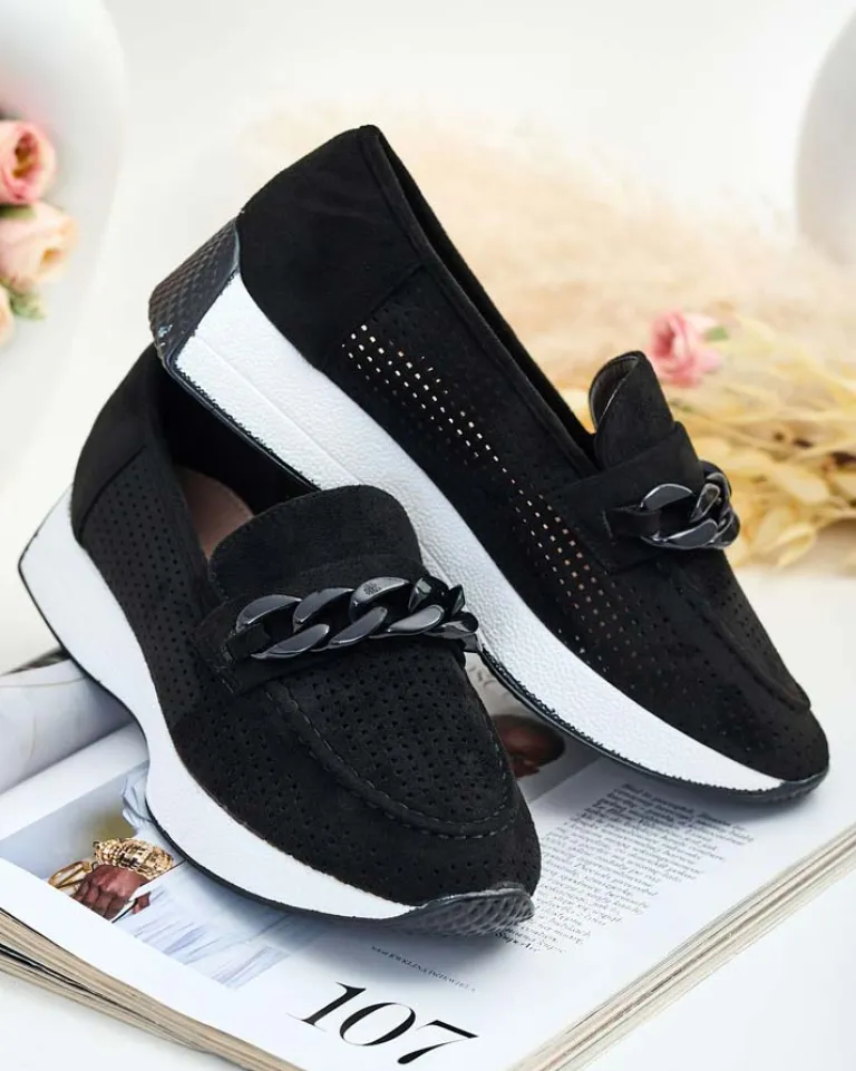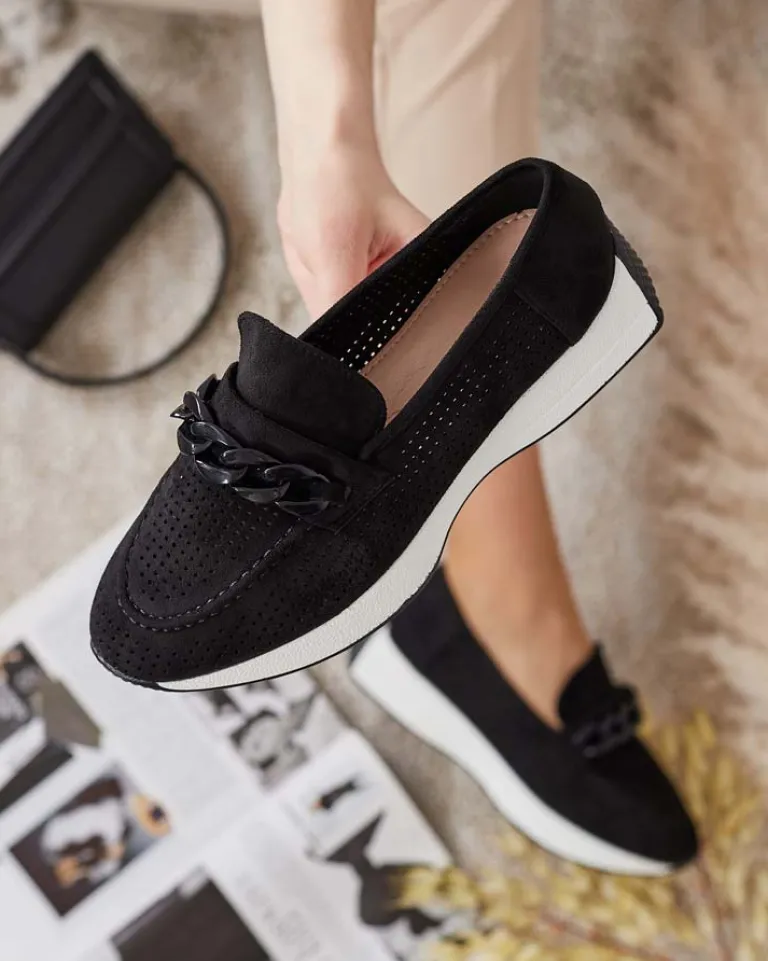 - Cudowne ażurowe damskie mokasyny na grubszej podeszwie. Model w tylu casual i jest wykonany ze skóry ekologicznej zamszowej, wkładka to skóra ekologiczna. Na nosku ozdobny łańcuszek. Będą świetną ozdobą do codziennych stylizacji.