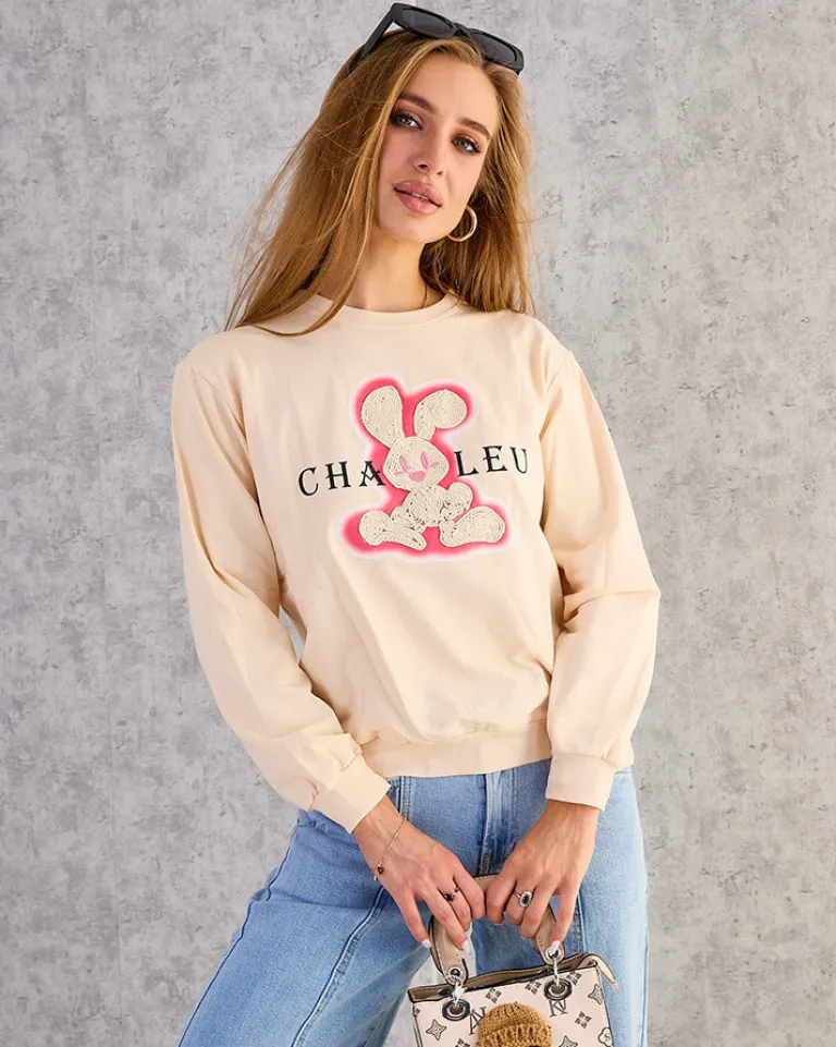 - Dodaj uroku swoim stylizacjom z naszą cieńszą bluzą, zdobioną naszywką króliczka. Wkładana przez głowę, z okrągłym dekoltem i długimi rękawami. Idealna na co dzień, gdy chcesz poczuć się swobodnie, a jednocześnie stylowo!