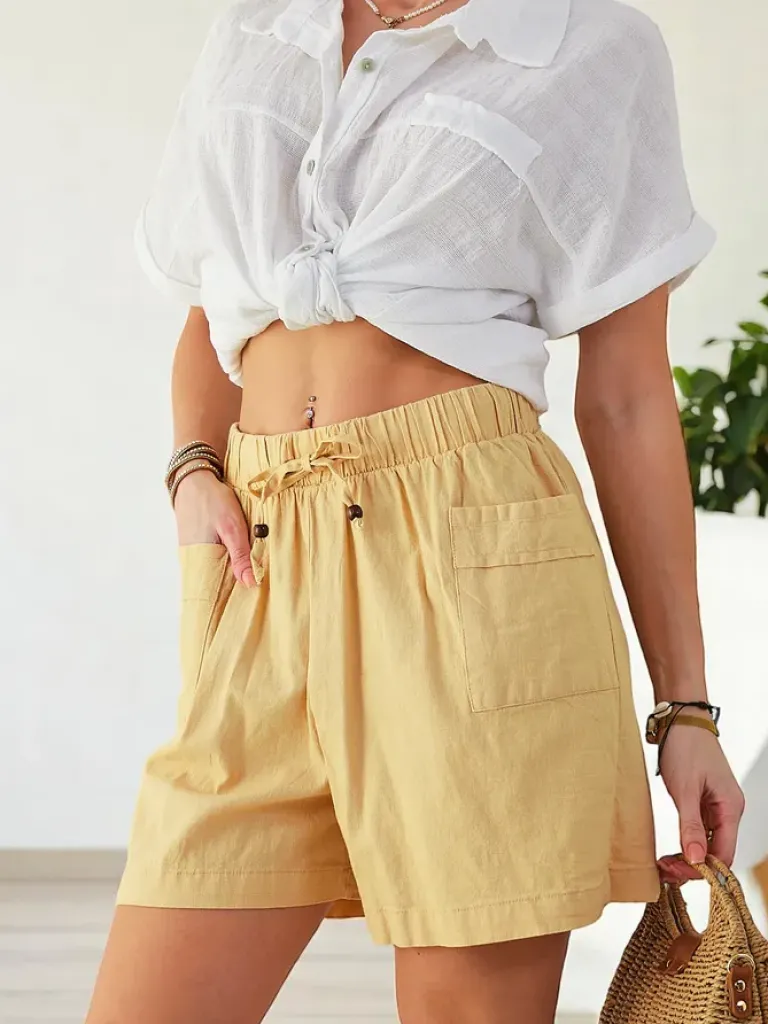 - Lekkie damskie krótkie spodenki materiałowe. Model z wysokim stanem, posiada dwie kieszenie oraz gumę w pasie. Idealny wybór na lato! UWAGA: Dokładność pomiaru (+/-) 1 cm.