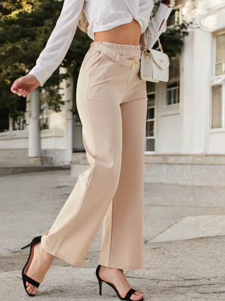 - Rewelacyjne szerokie spodnie wykonane z lekkiej tkaniny, model posiada 2 kieszenie, gumę w pasie. Dodatkowo zdobienie a’la pasek. Must have w Twojej szafie! UWAGA: Dokładność pomiaru (+/-) 1 cm.