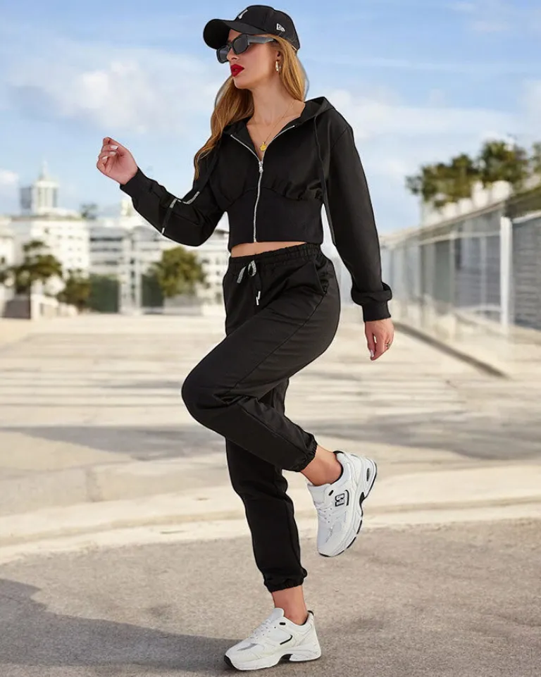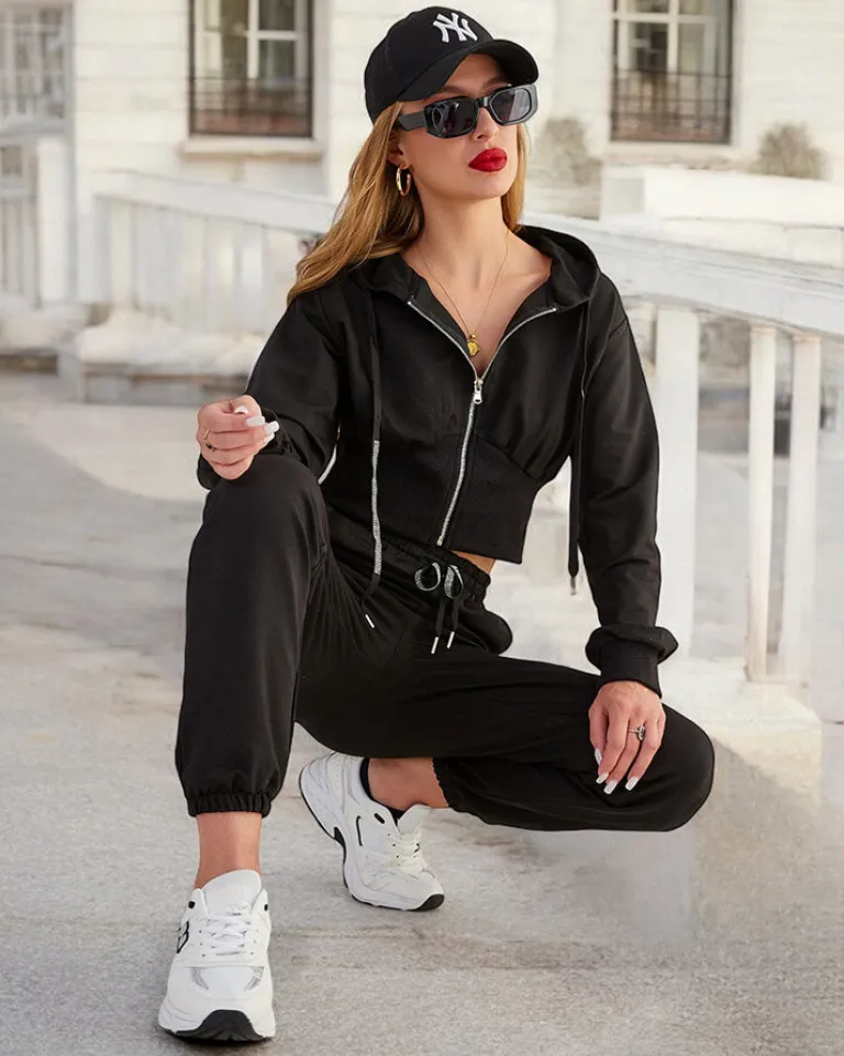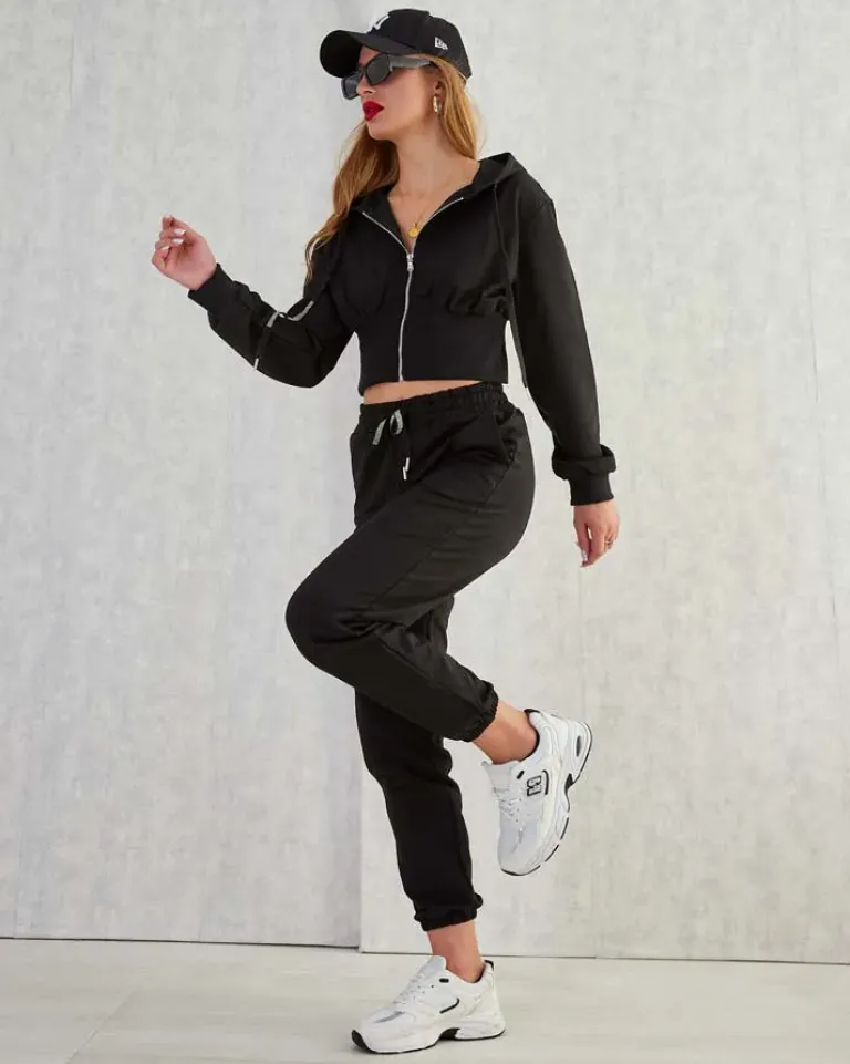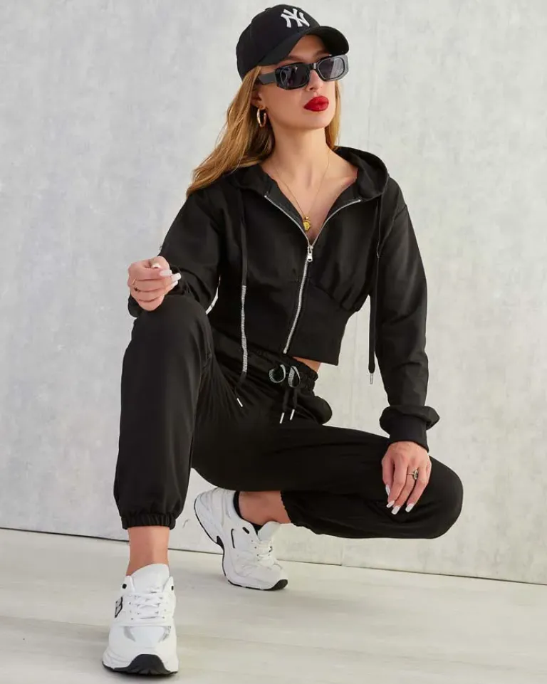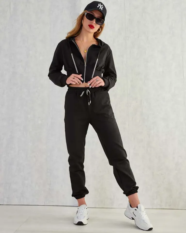 - Damski komplet dresowy wykonany z przyjemnej tkaniny. Bluza zapinana na suwak, z kapturem oraz spodnie z gumką w pasie z troczkami i 2 kieszeniami. Troczki zdobione cyrkoniami. UWAGA: Dokładność pomiaru (+/-) 1 cm.
