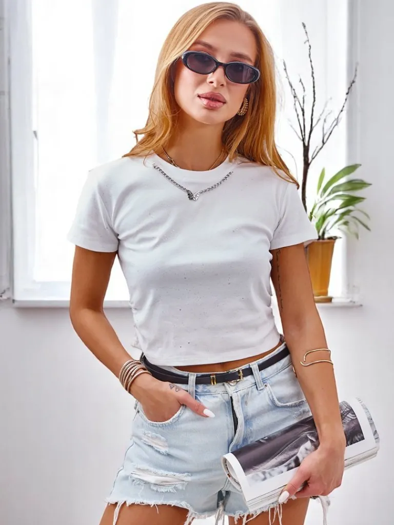 - Bawełniany damski t-shirt z marszczeniami po bokach, łańcuszkiem i brokatem, łączący wygodę z subtelnym blaskiem. Idealny do casualowych stylizacji, dodaje wyjątkowego uroku każdemu lookowi.