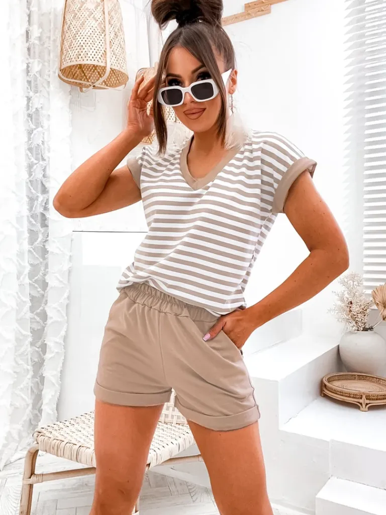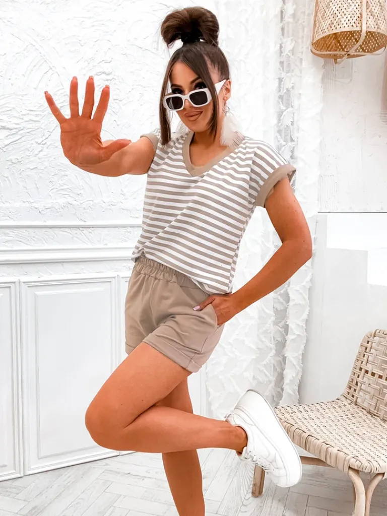 - Wiosenny, bawełniany komplet damski z krótkimi spodenkami i t-shirtem. Spodenki posiadają 2 kieszenie i gumę w pasie. Koszulka z krótkimi rękawami zdobiona wzorem w paski. Świetny zestaw na cieplejsze dni! UWAGA: Dokładność pomiaru (+/-) 1 cm.