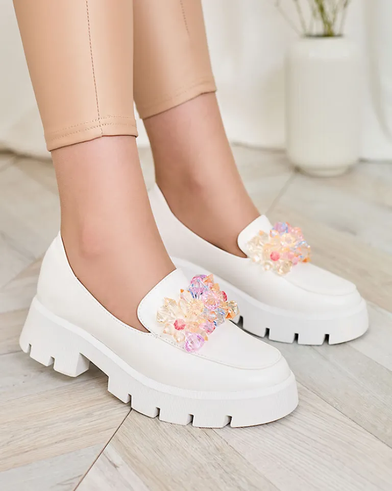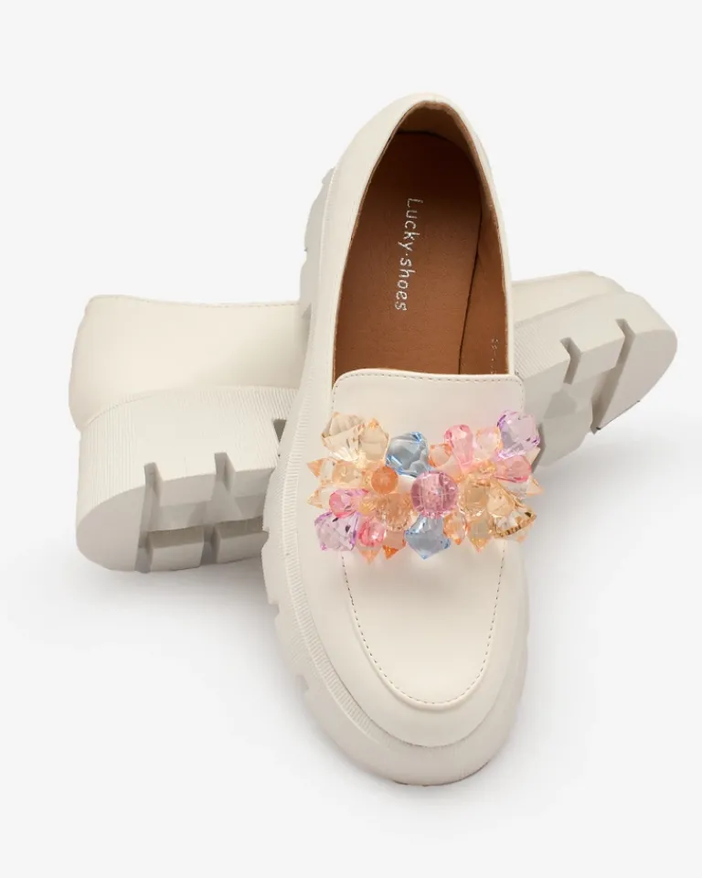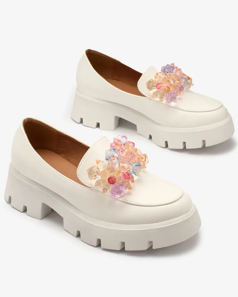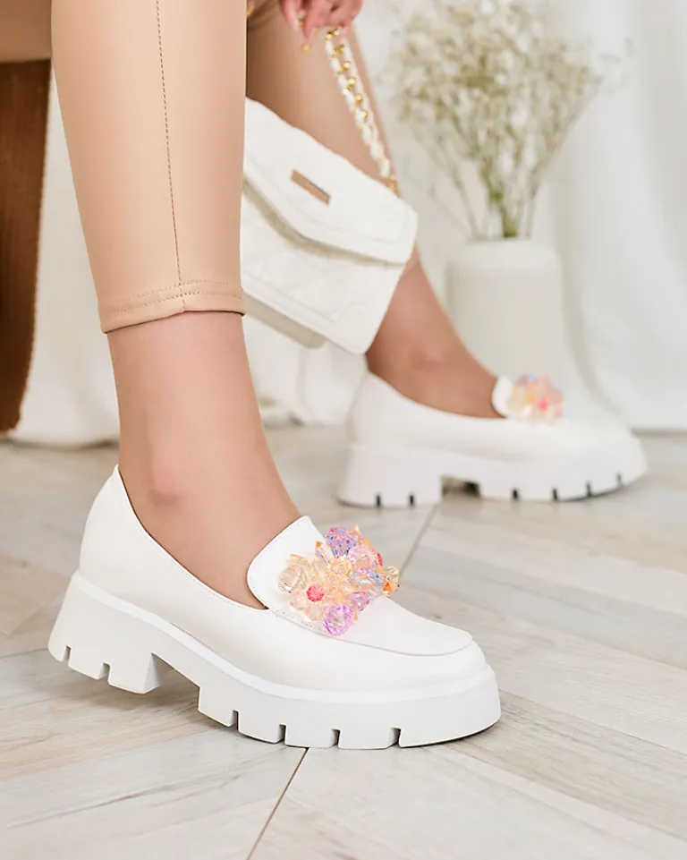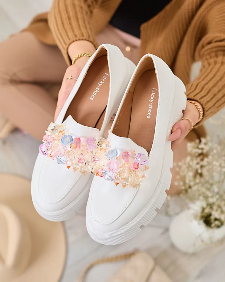 - Przepiękne mokasyny na masywnej podeszwie to połączenie stylu i wygody. Nosek zdobiony kolorowymi kryształkami dodaje im niezwykłego blasku i uroku. Cholewka wykonana z eko-zamszu, a wnętrze wyłożone eko-skórą. Dodadzą blasku i elegancji do stylizacji.