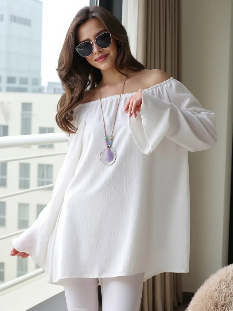 - Wyjątkowa damska bluzka a’la hiszpanka wykonana z miękkiego, przyjemnego materiału. Posiada okrągły dekolt z gumką oraz rękawy zdobione falbankami. Dodatkowo naszyjnik w zestawie. Idealna na co dzień jak i specjalne okazje!