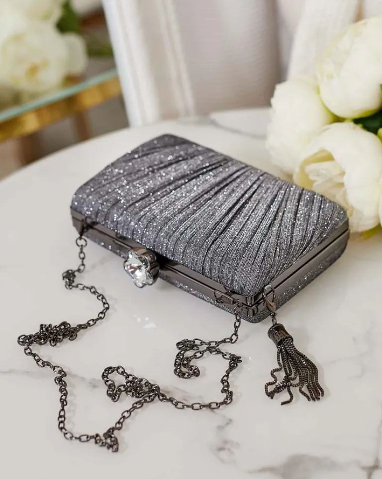 - Elegancka mała torebka damska zdobiona brokatową nicią. Model z zapięciem na zatrzask w postaci kryształu, posiada 1 komorę i 1 kieszonkę. Dodatkowo odpinany łańcuszek na ramię i breloczek. Idealna na oficjalne wyjścia!