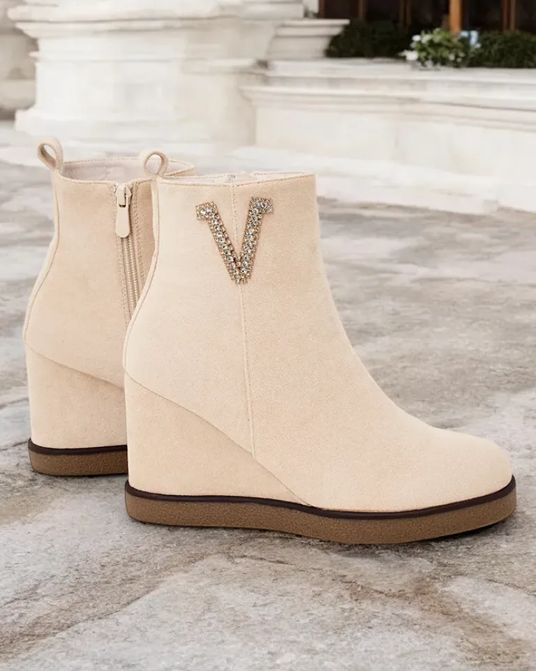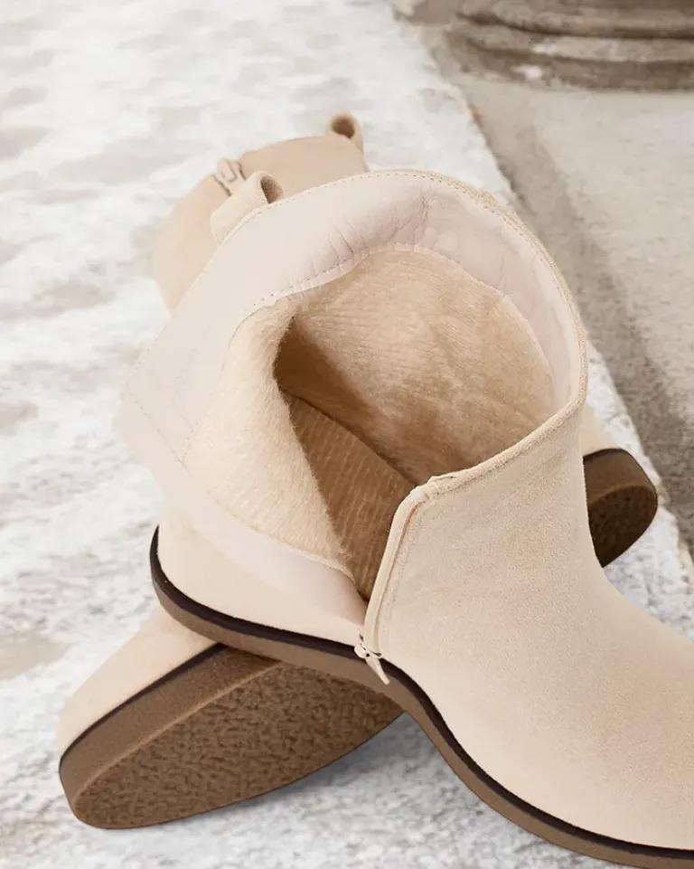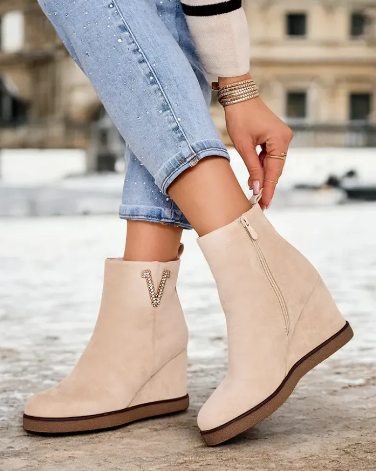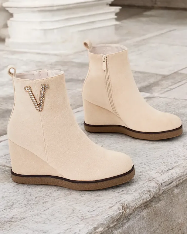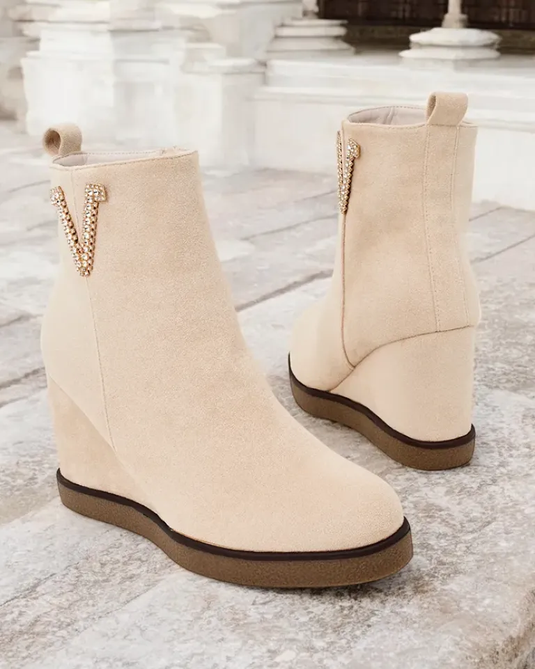 - Eleganckie damskie botki na koturnie, wykonane z eko-zamszu. Obuwie wypełnione od środka futerkiem. Idealny wybór na jesień!