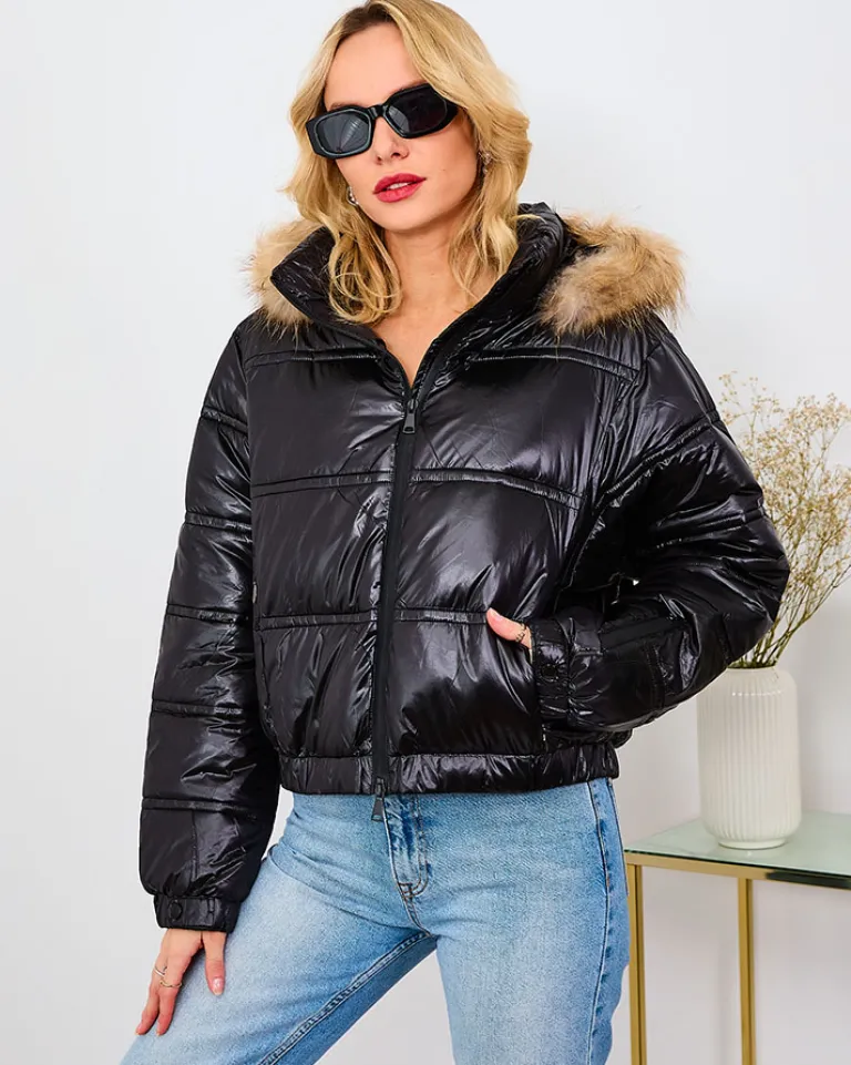 - Krótka kurtka damska, wykonana z materiału a’la cerata: