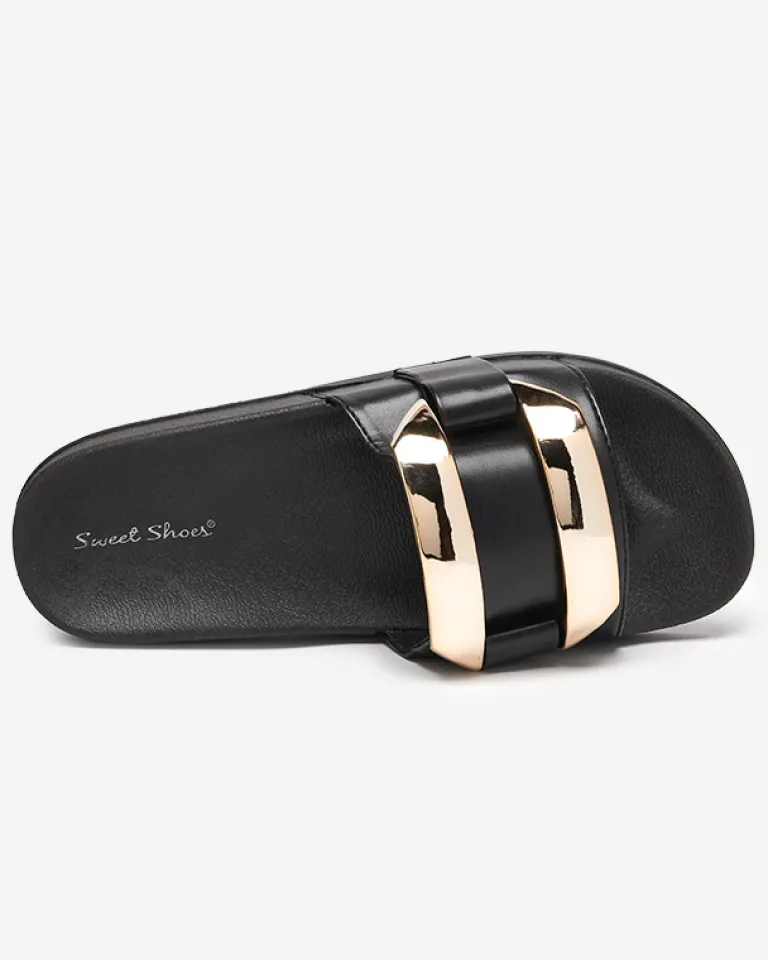 - Stylowe damskie klapki na płaskiej podeszwie, wykonane ze skóry ekologicznej. Model z dużą plastikową ozdobą w złotym kolorze, posiada wkładkę i podeszwę z tworzywa gumowego. UWAGA: model może posiadać delikatne zarysowania na cholewce.