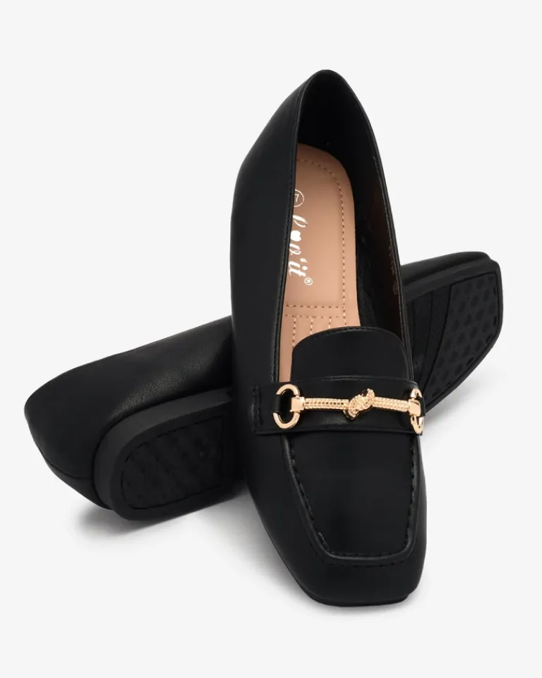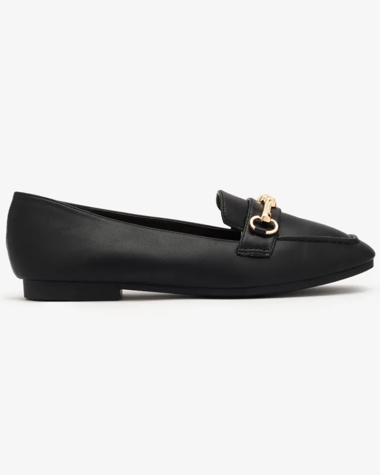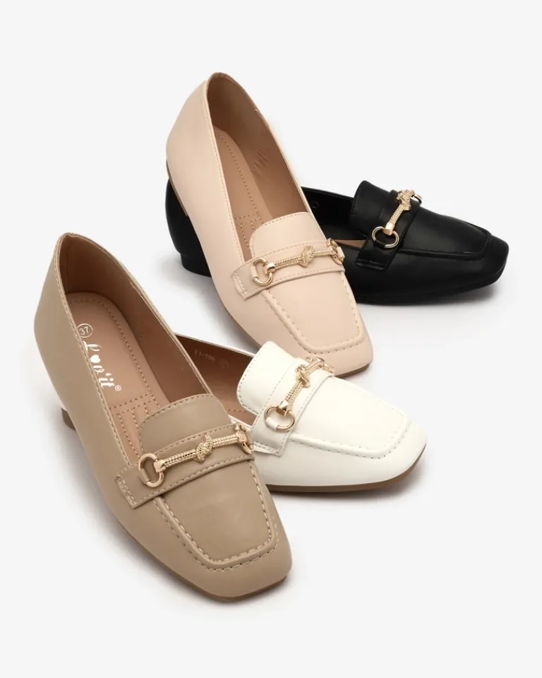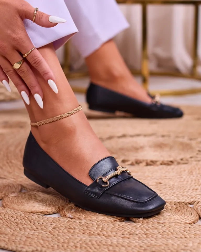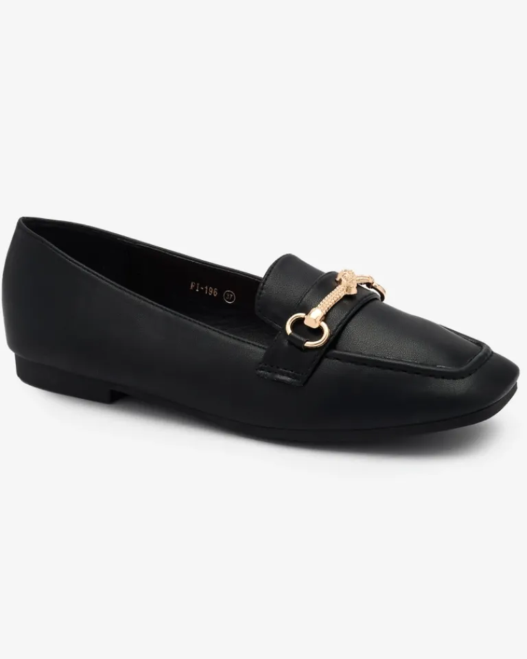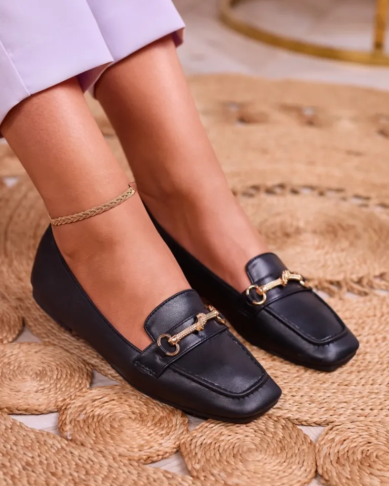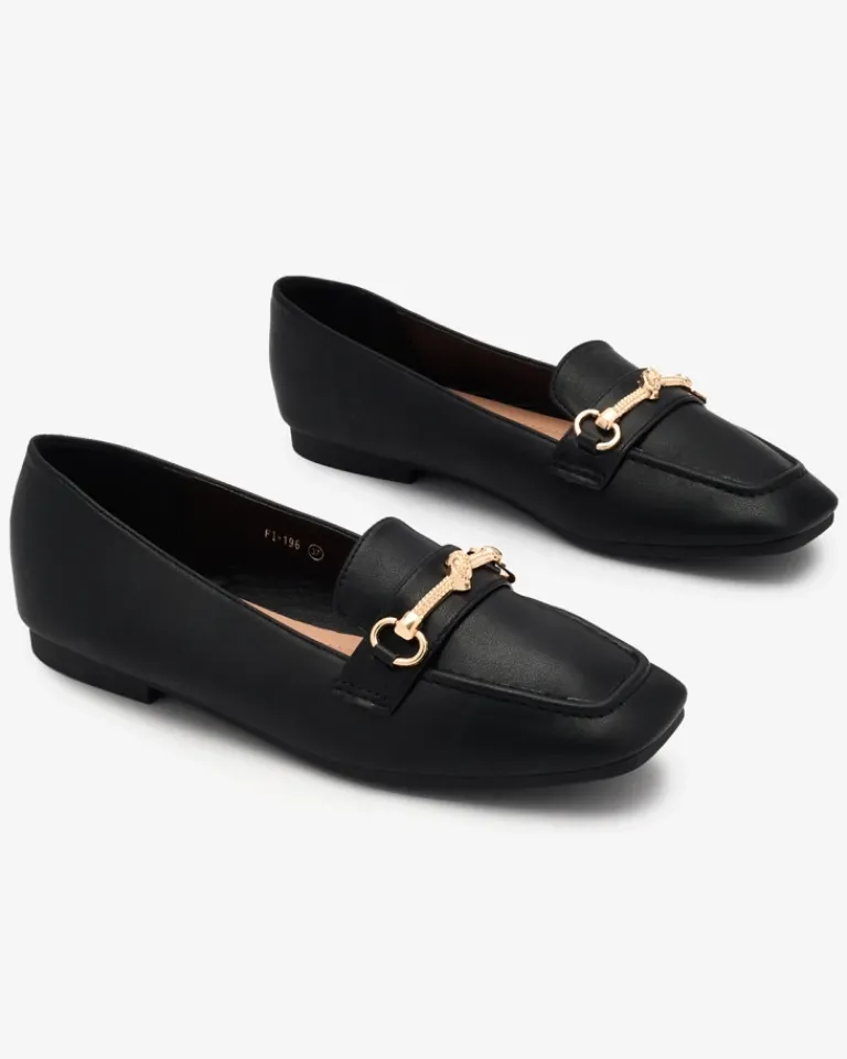 - Klasyczne damskie mokasyny na płaskim obcasie. Cholewka jak i wkładka wykonane ze skóry ekologicznej. Na kwadratowym nosku metalowa ozdoba w złotym kolorze. Idealna baza dla wielu codziennych looków!