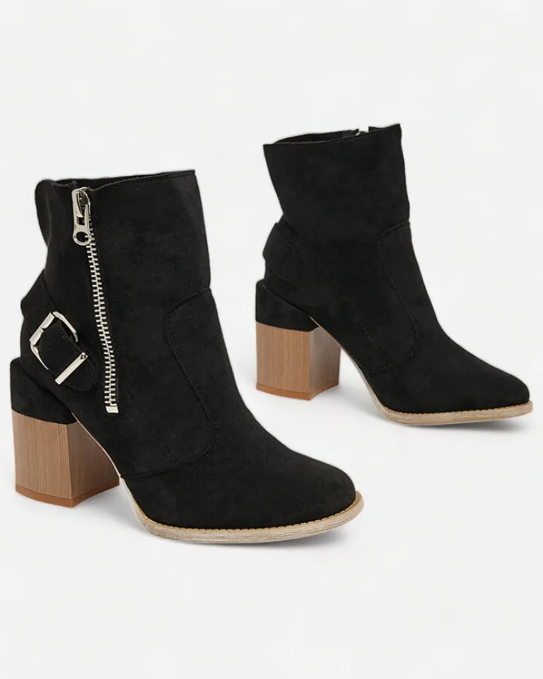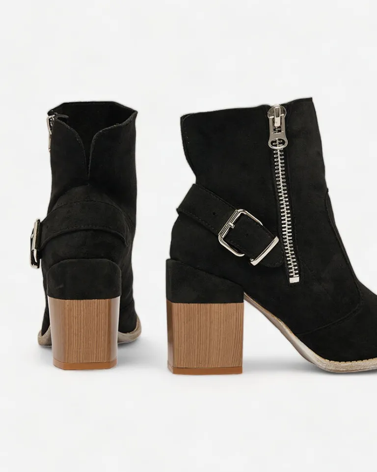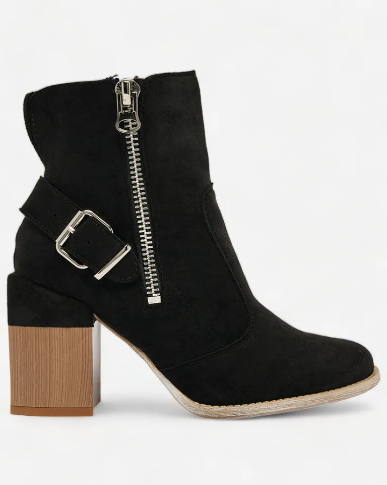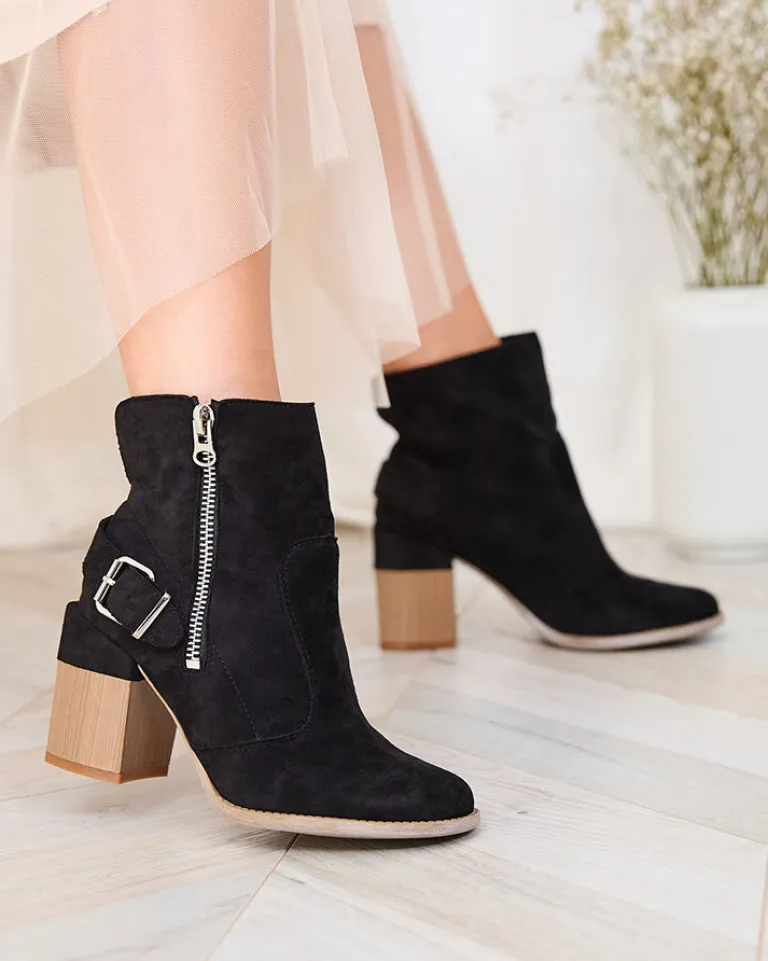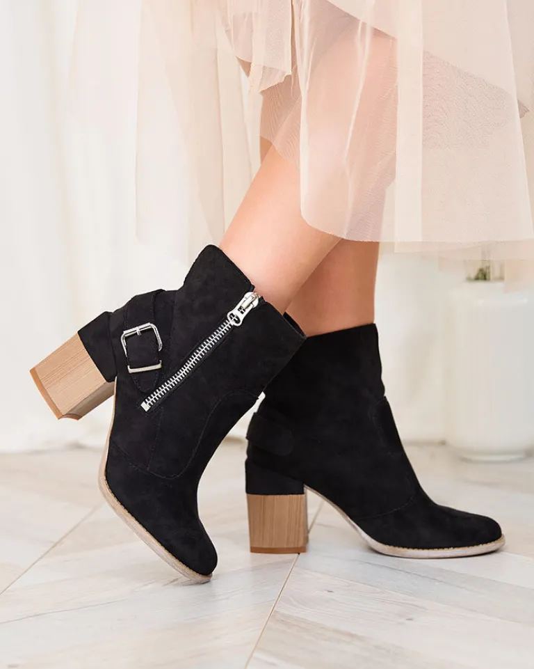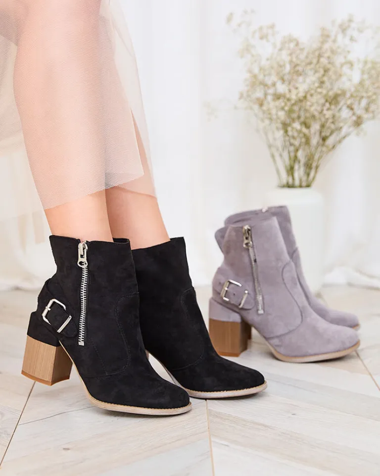 - Rewelacyjne botki na wysokim słupku wykonane z miękkiego eko-zamszu, zaś wkładka pokryta tkaniną. Model zapinany na suwak. Będą świetną ozdobą do jesiennych stylizacji!