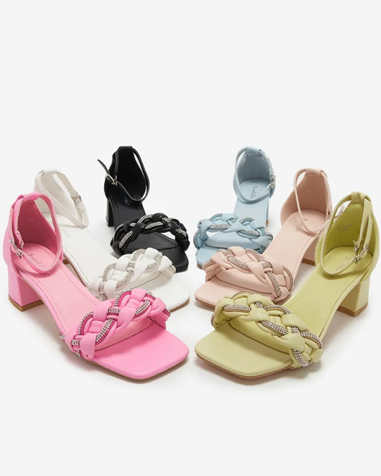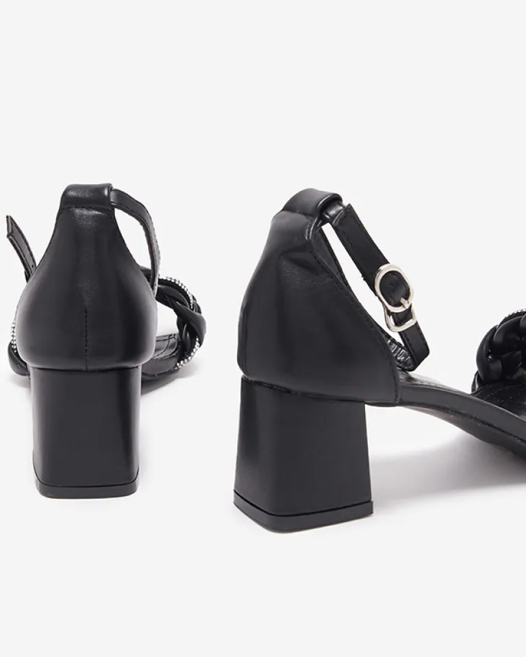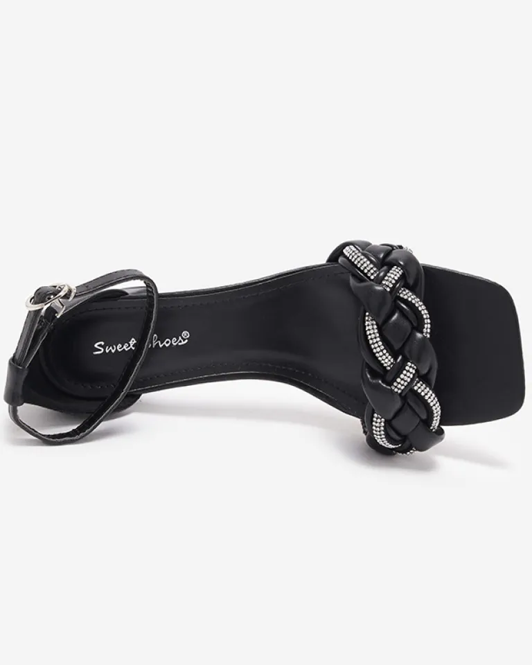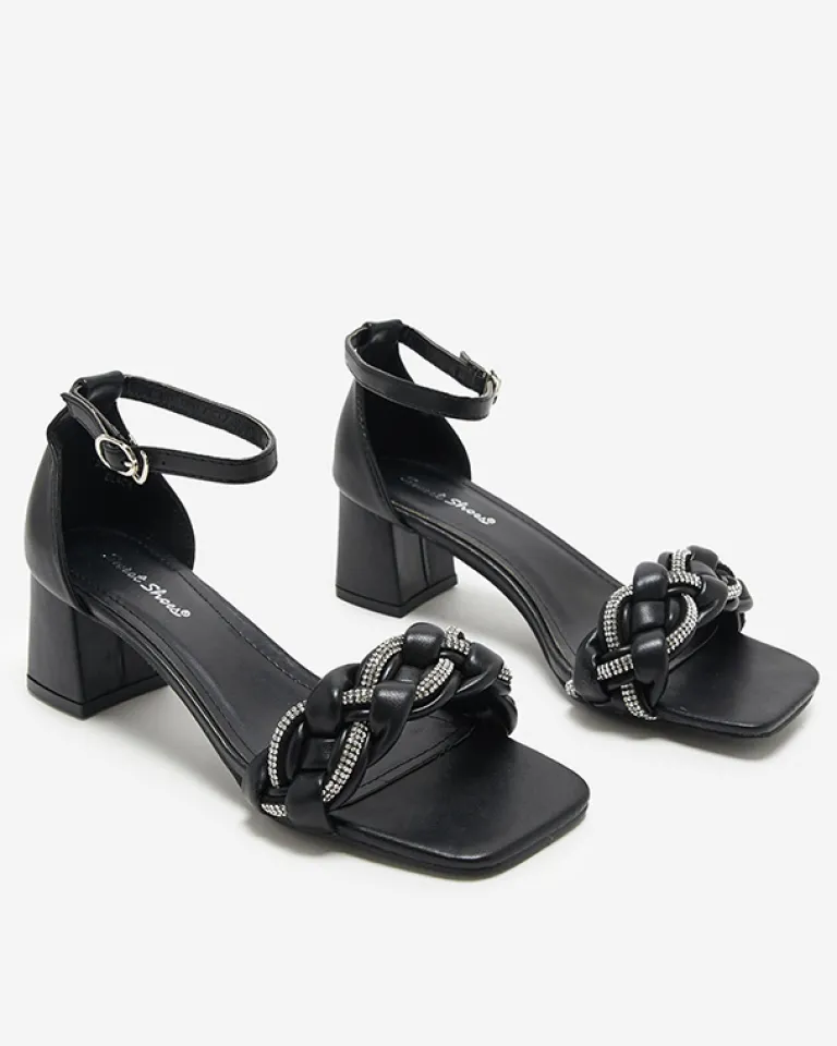 - Sandały damskie na słupku wykonane ze skóry ekologicznej. Sandałki posiadają pleciony paseczek z cyrkoniami, model zapinany sprzączką. Idealne na wieczorne wyjścia!