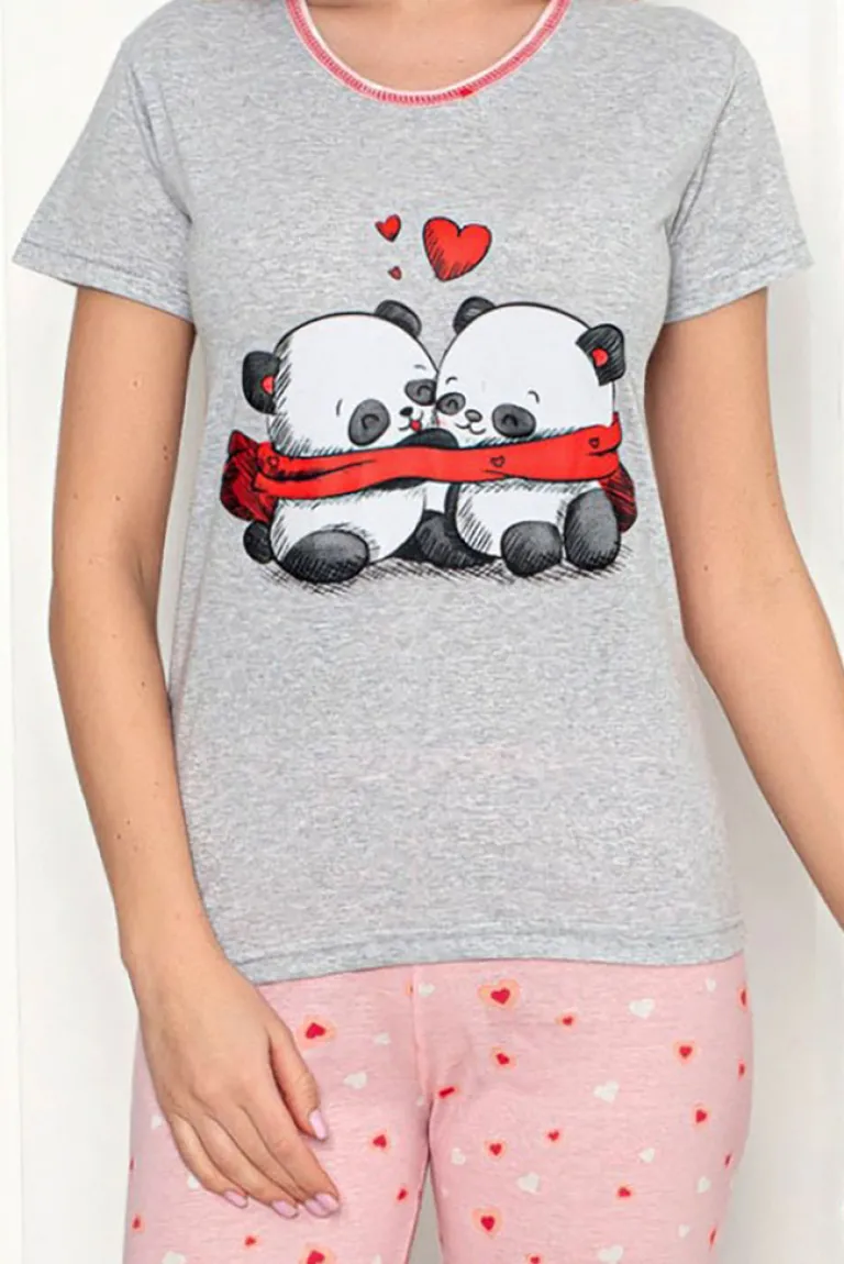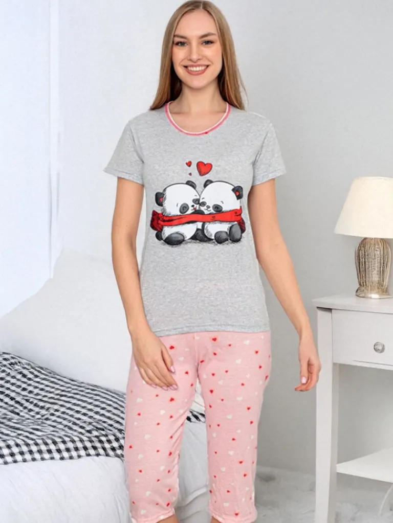 - Damska 2-częściowa piżama wykonana z tkaniny bawełnianej wykończonej ozdobnym printem. Komplet posiada bluzkę z długimi rękawami oraz spodnie 3/4 z gumą w pasie.