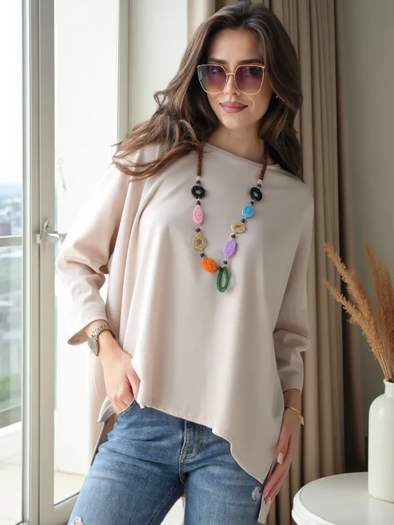 - Oryginalna damska bluzka z okrągłym dekoltem, wykonana z przyjemnej i miękkiej tkaniny. Produkt o luźnym kroju, posiada rękaw o długości 3/4. Dodatkowo naszyjnik w zestawie. Idealny wybór do tworzenia stylowych outfitów!