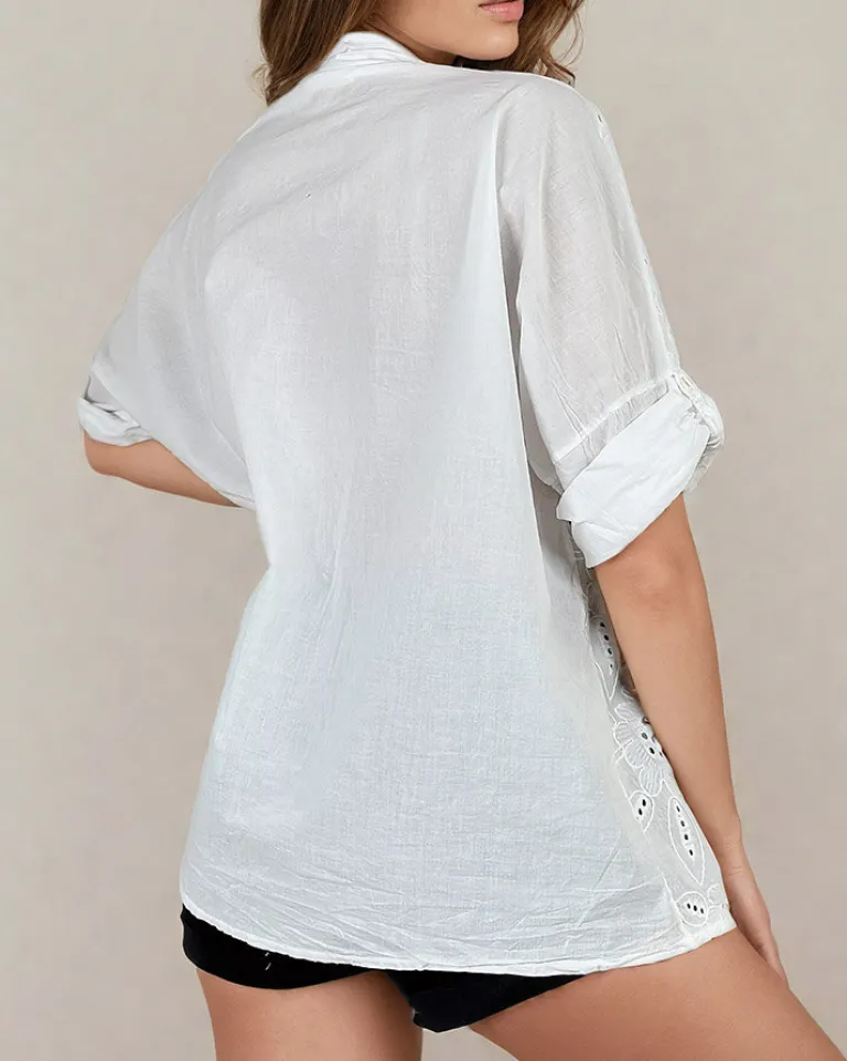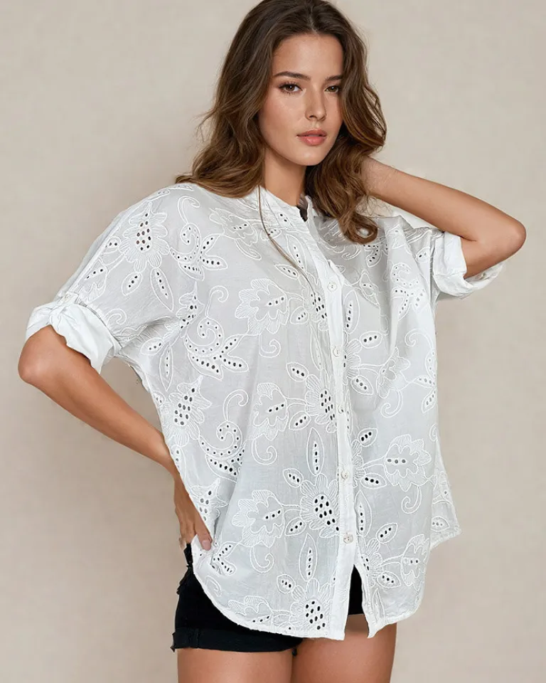 - Klasyczna damska koszula oversize, wykonana z przyjemnej tkaniny. Posiada kołnierzyk, jest zapinana na guziki oraz ozdobny haft. Model posiada podwijane rękawki. Prosty krój zapewni dopasowanie do każdej sylwetki! UWAGA: Dokładność pomiaru (+/-) 1 cm.