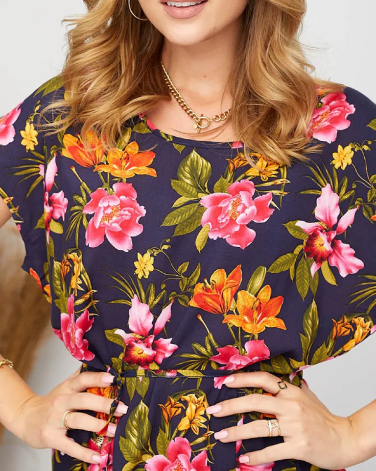 - Damska sukienka w kwiaty, wykonana ze zwiewnej tkaniny wiskozowej. Produkt z wiązaniem podkreślającym talię, posiada krótkie rękawy i okrągły dekolt. Idealna na letnie upały! Dokładność pomiaru (+/-) 1 cm.