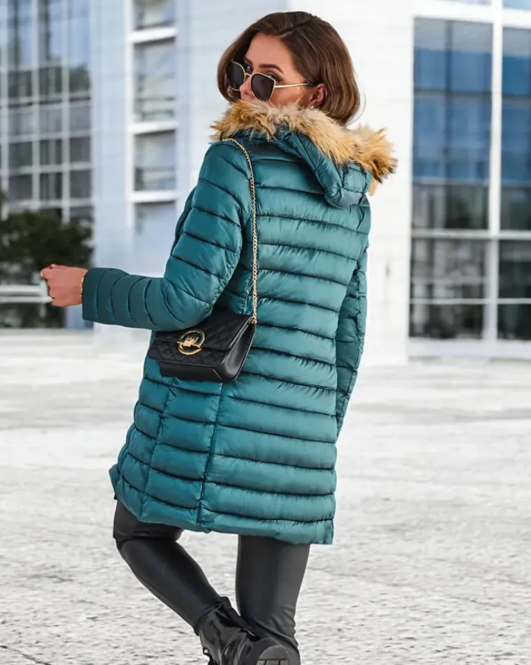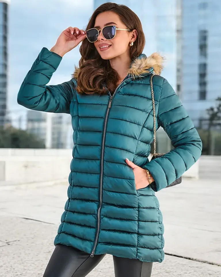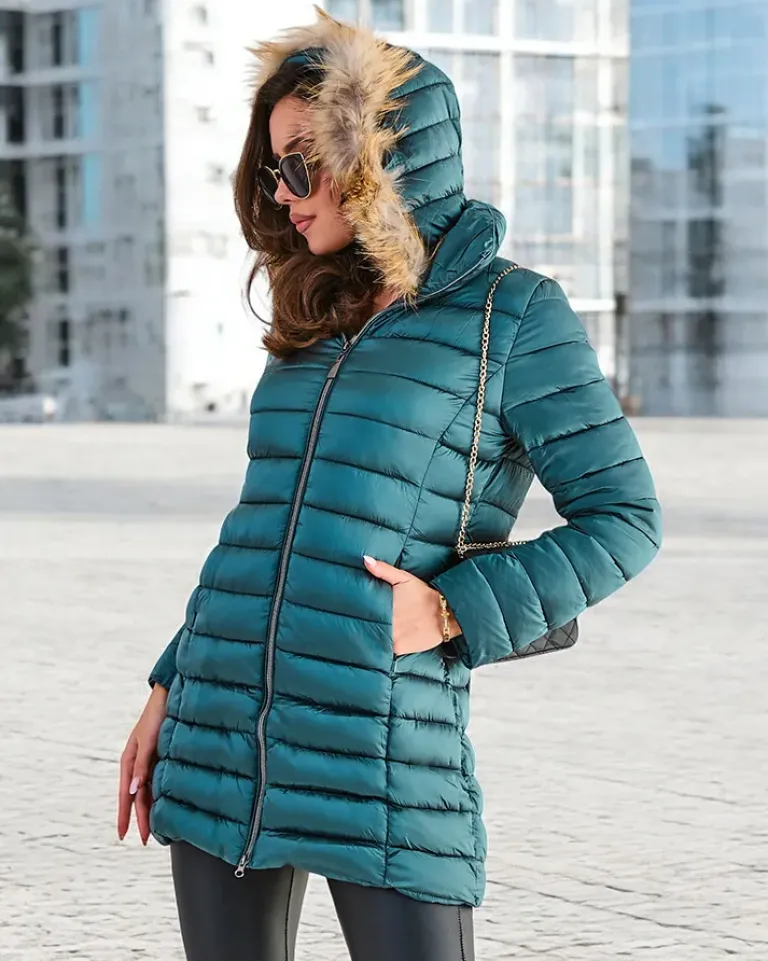- Ciepła pikowana damska kurtka zimowa. Kurta posiada odpinany kaptur z nieodpinanym futerkiem oraz dwie kieszenie. Jest zapinana na zamek. Model wypełniony puchem syntetycznym. Idealna na zimę!