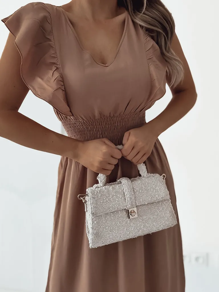 - Wyjątkowa damska sukienka wykonana z lekkiej tkaniny. Na wysokości talii posiada gumkę. Produkt o długości midi, posiada krótkie rękawy. Poczuj lato w tym modelu!