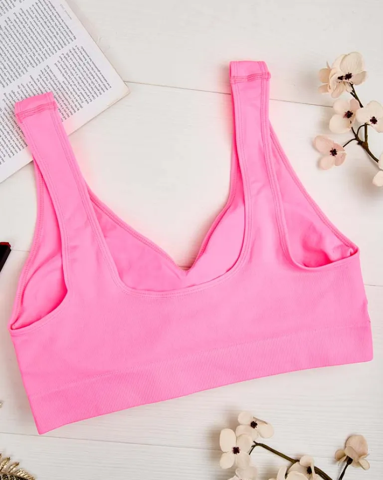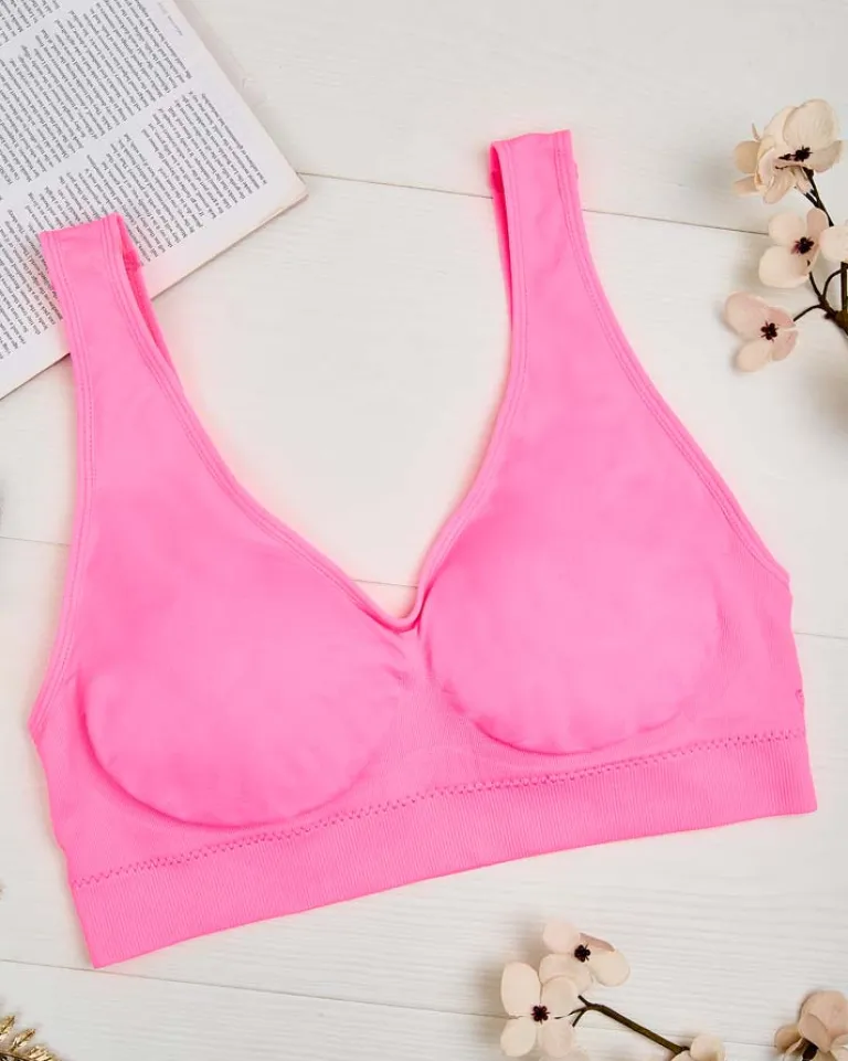 - Klasyczny sportowy damski biustonosz wykonany z elastycznego, przyjemnego materiału. Model z szerokimi ramiączkami i z wyjmowanymi wkładkami, wykończony na dole szeroką gumą. Idealnie dopasuje się do ciała.