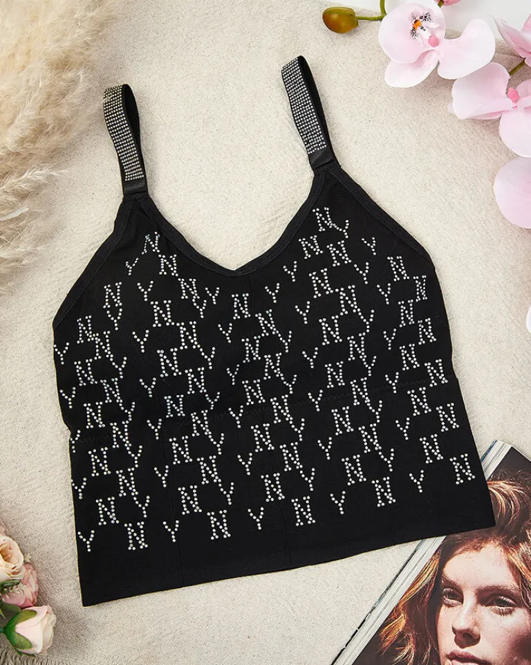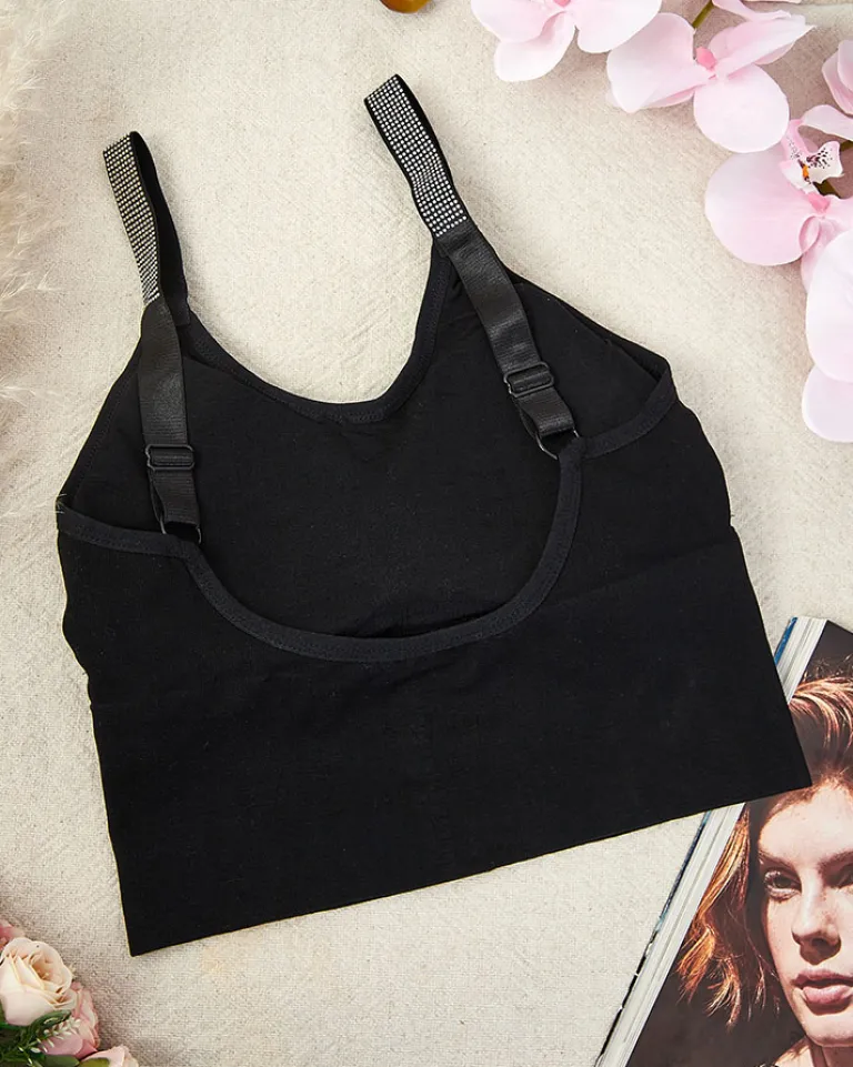 - Sportowy damski biustonosz wykonany z elastycznego, przyjemnego materiału. Model z regulowanymi ramiączkami, bez zapięcia i z wyjmowanymi wkładkami, wykończony na dole szeroką gumą i zdobiony cyrkoniami. Możesz go nosić również jako top!