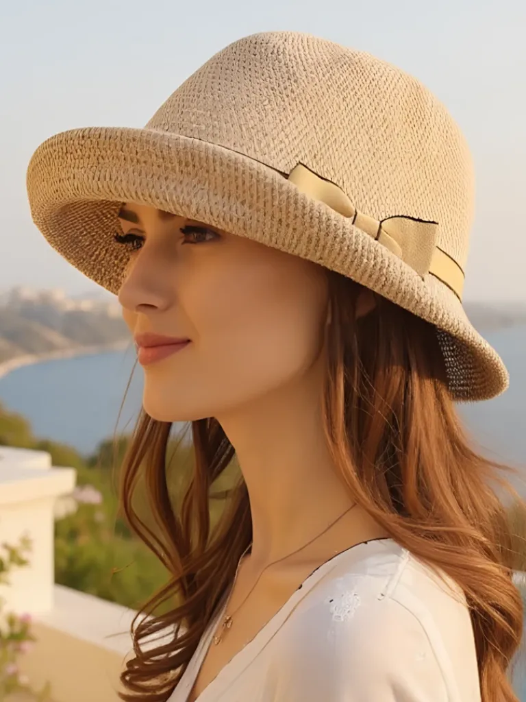 - Lekki, tkaninowy kapelusz pleciony a’la słoma, ozdobiony uroczą kokardką. Idealny na słoneczne dni – stylowa ochrona i letni akcent każdej stylizacji.