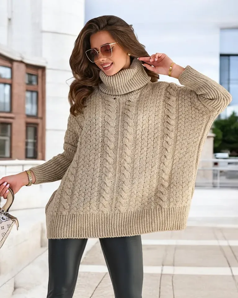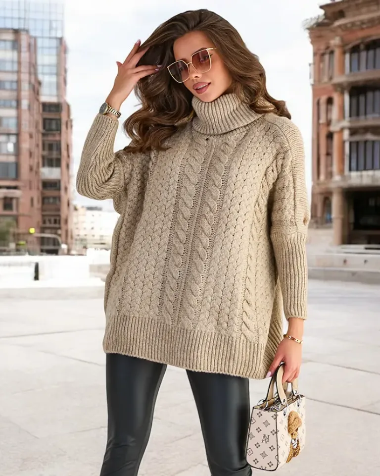 - Ten klasyczny sweter to esencja wygody i uroku. Wykonany z miękkiego materiału, sweter posiada golf i długie rękawy. Dzianinowa plecionka dodaje mu wyjątkowego uroku!