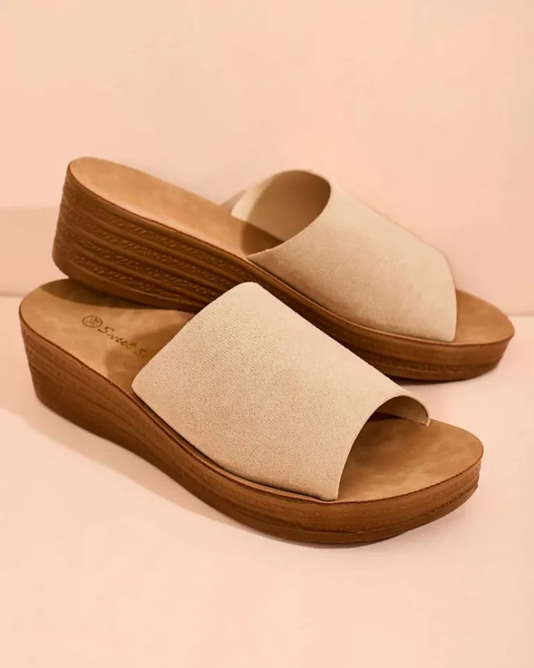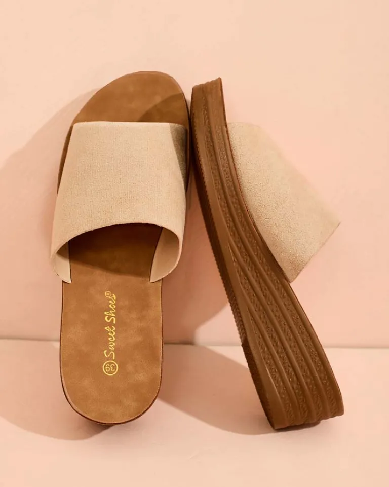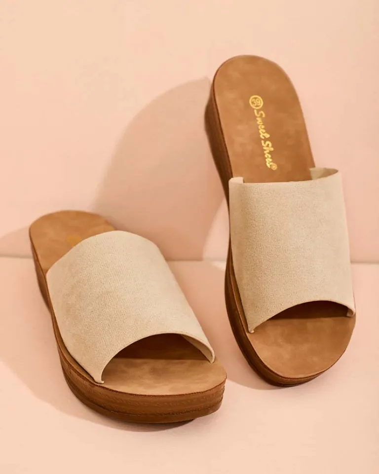 - Klapki damskie wykonane z zamszowej eko skóry i eko skórzanej wkładki. Niski koturn i platforma dodaje uroku i charakteru. Ciesz się wygodą i stylem zabierając te obuwie na wakacje!