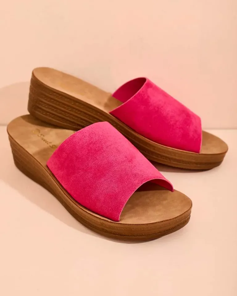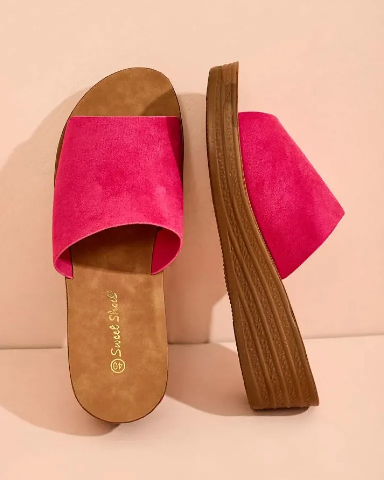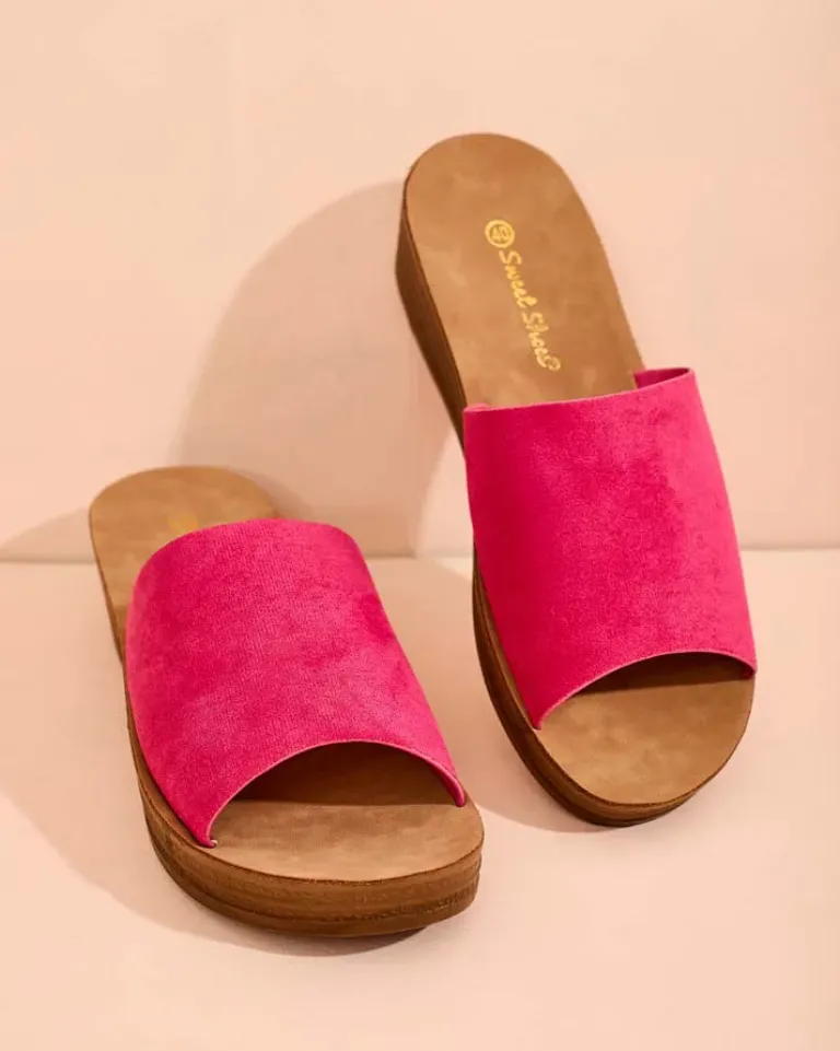 - Klapki damskie wykonane z zamszowej eko skóry i eko skórzanej wkładki. Niski koturn i platforma dodaje uroku i charakteru. Ciesz się wygodą i stylem zabierając te obuwie na wakacje!