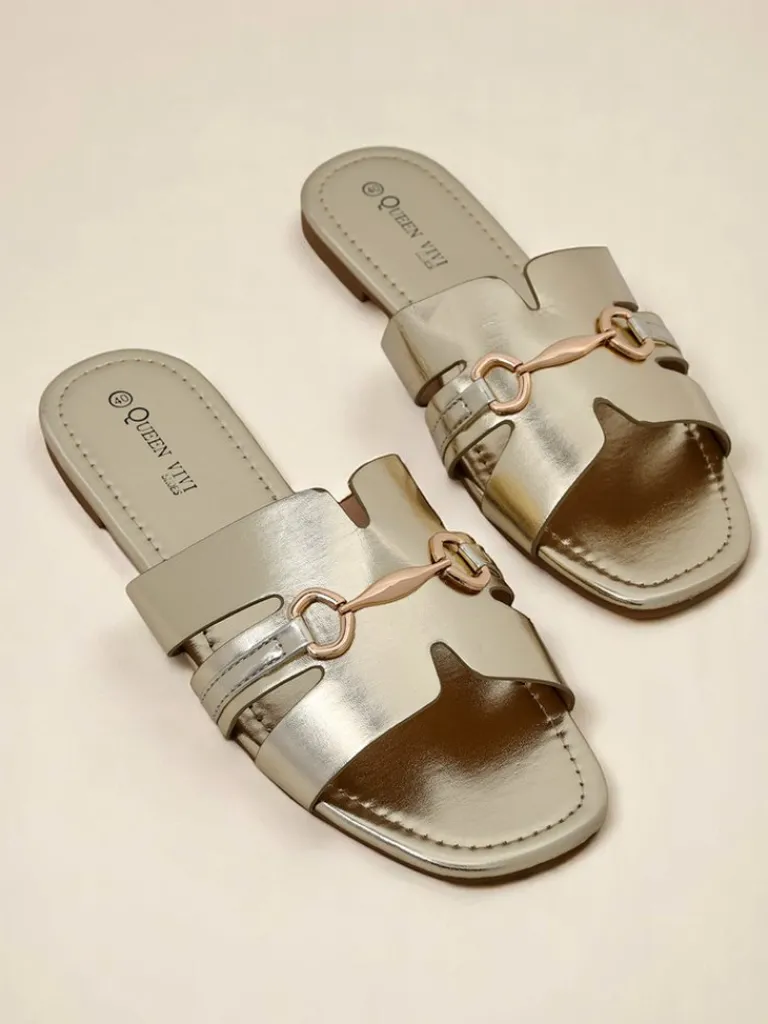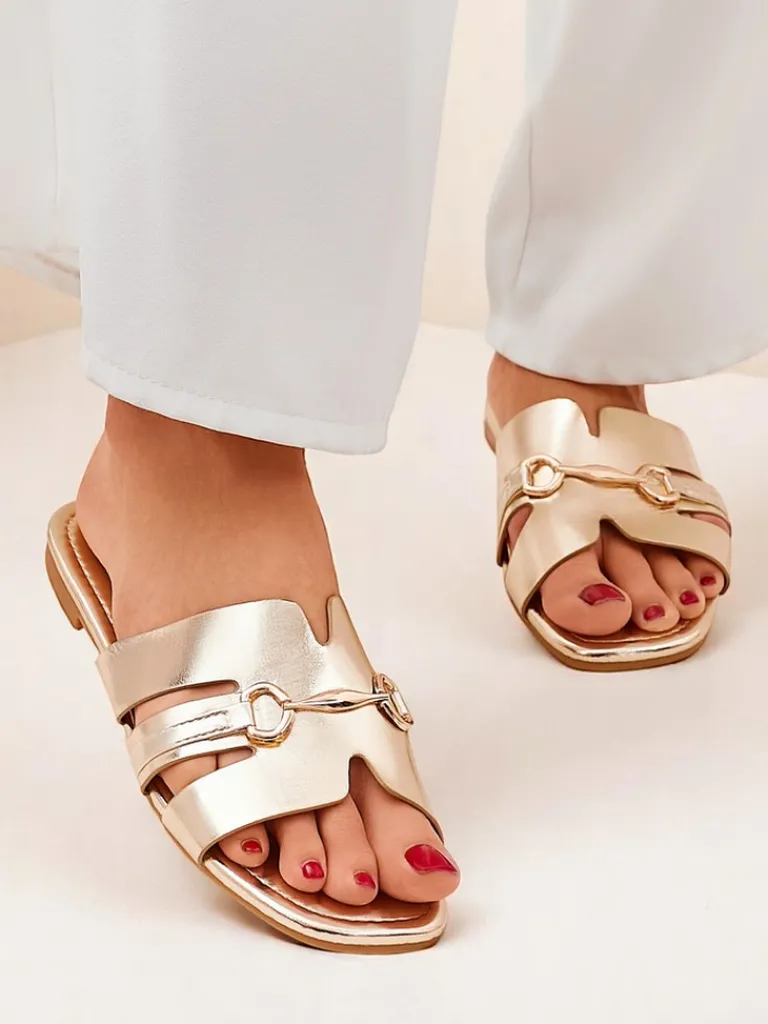 - Klapki z ekologicznej skóry, ozdobione subtelną złotą ozdobą. Elegancka prostota i komfort, które pasują do każdej letniej stylizacji.