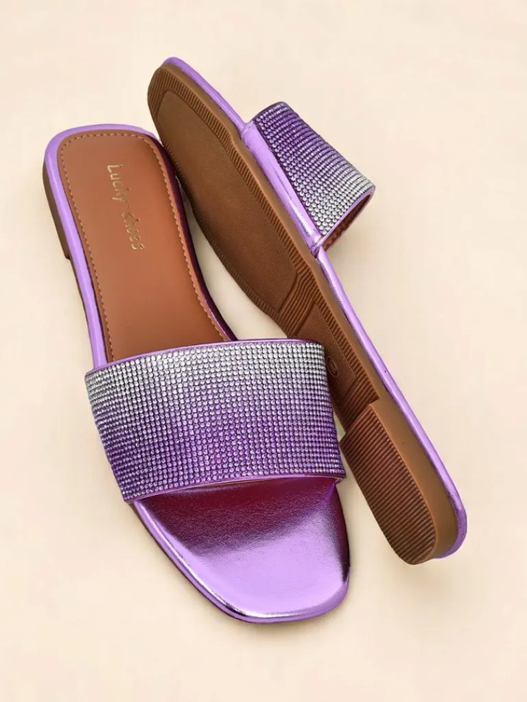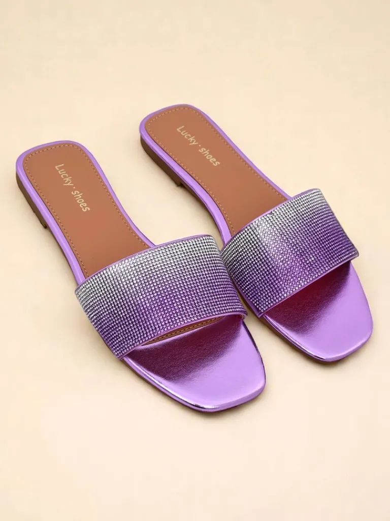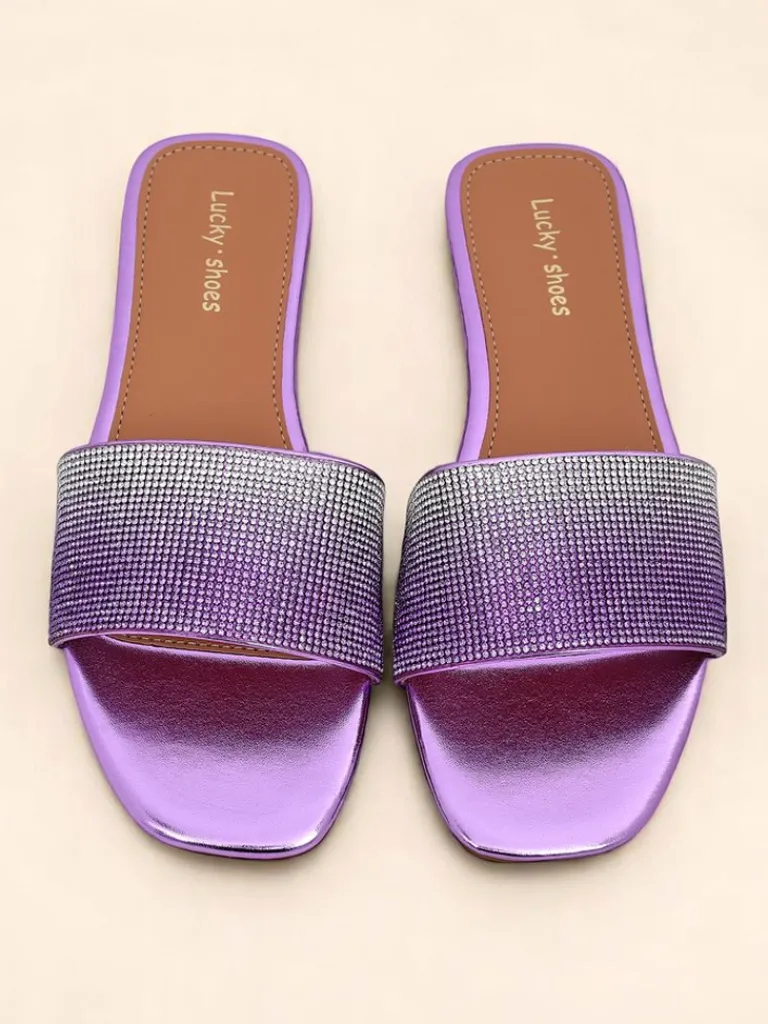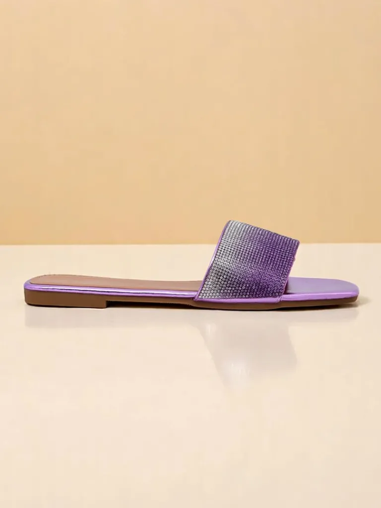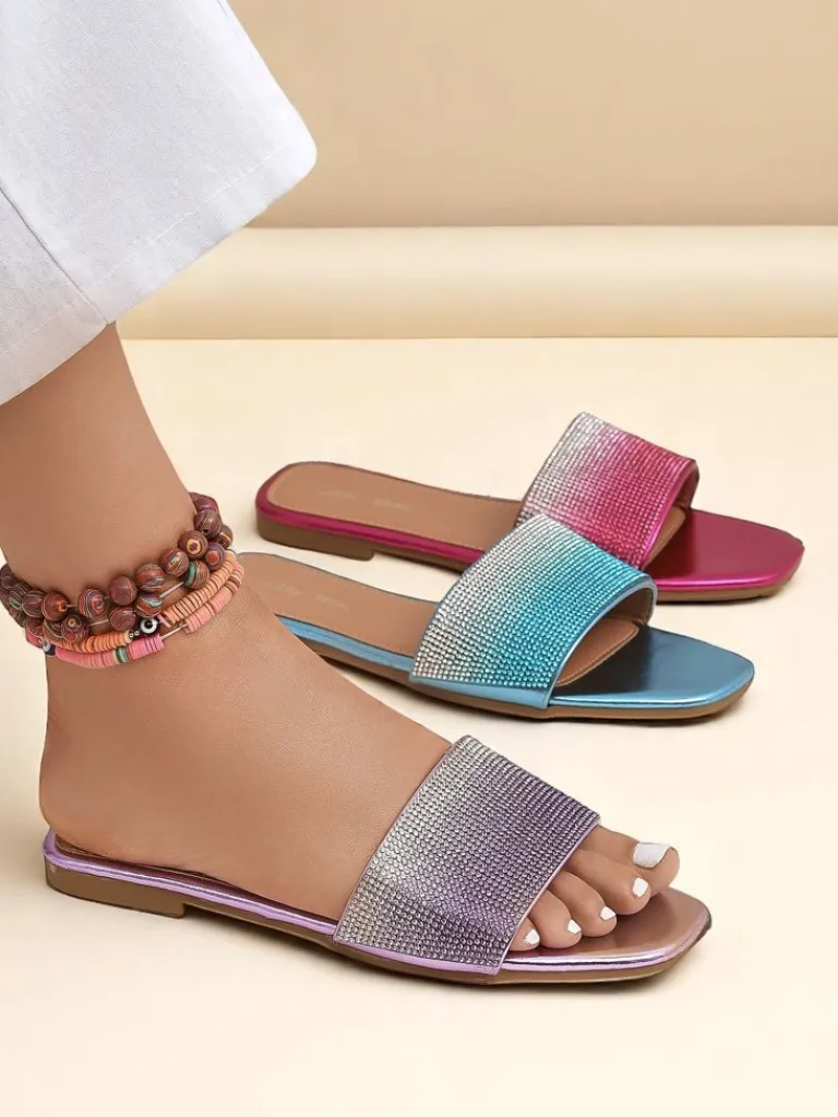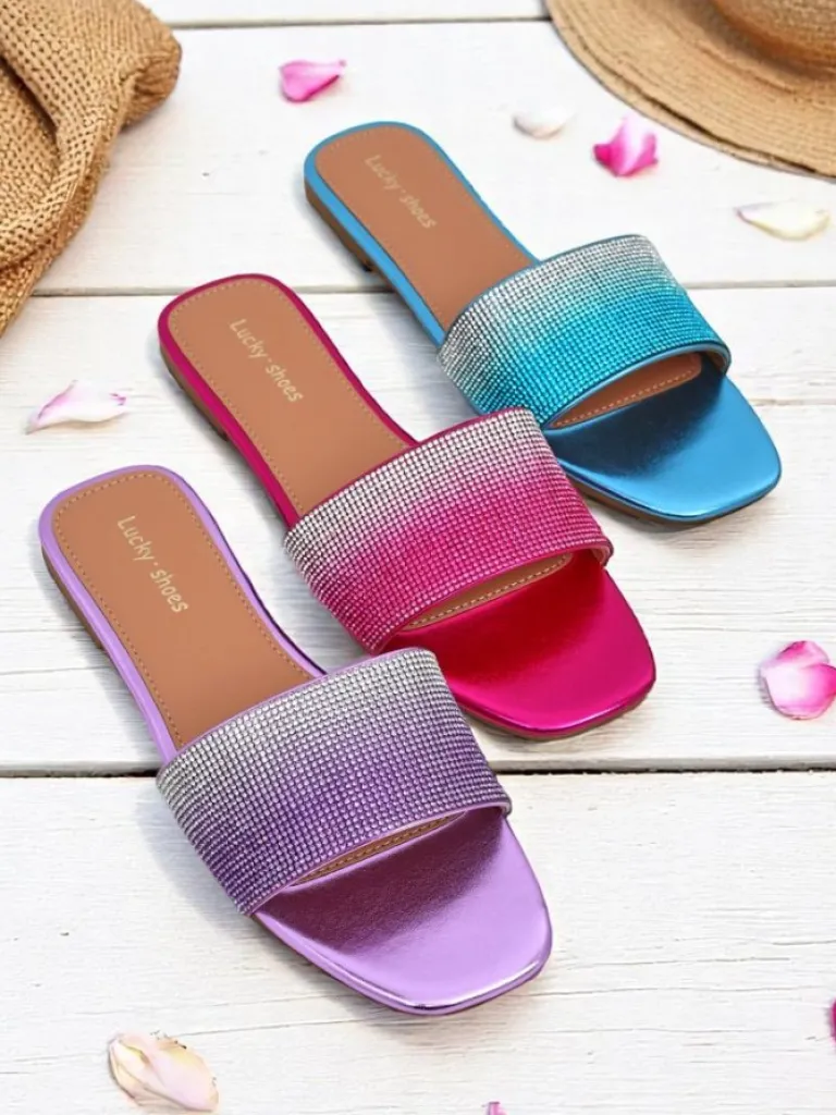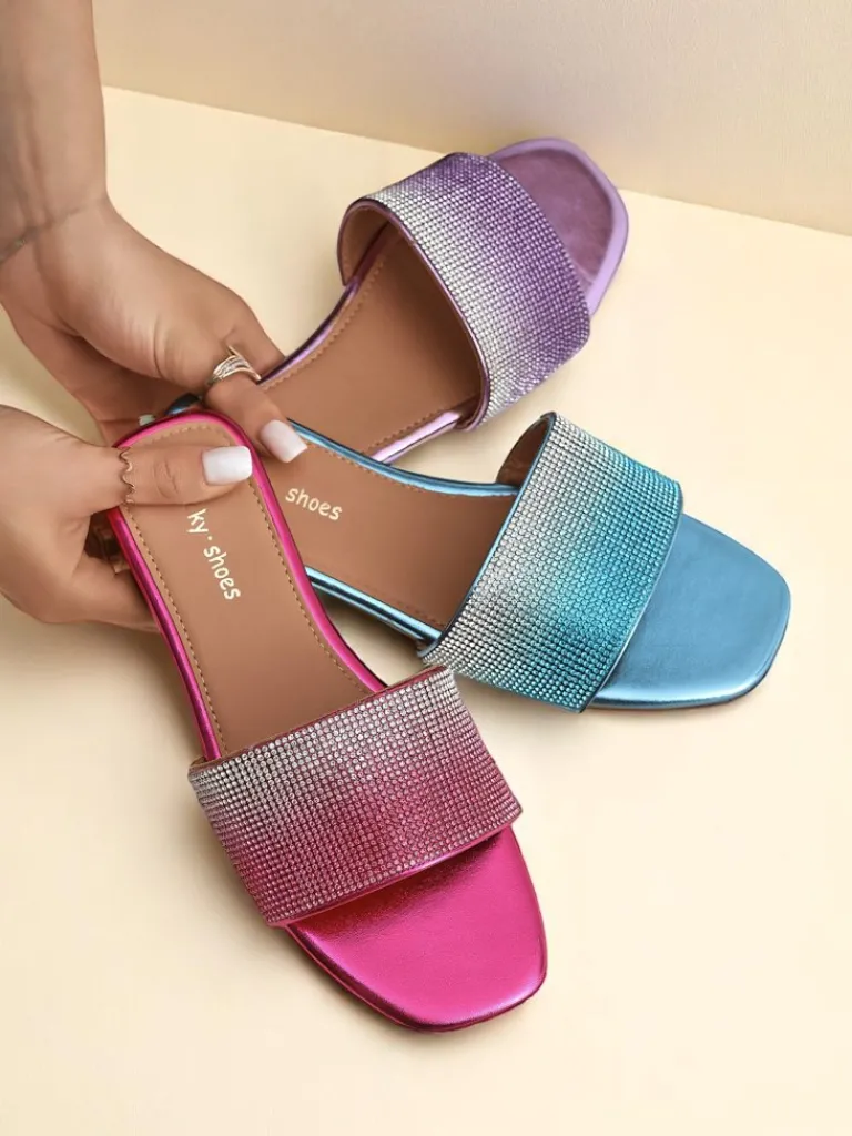 - Płaskie klapki damskie z eko skóry ozdobione cyrkoniami i efektem ombre. Stylowe, błyszczące i wygodne – idealne na lato, dodadzą blasku każdej stylizacji.