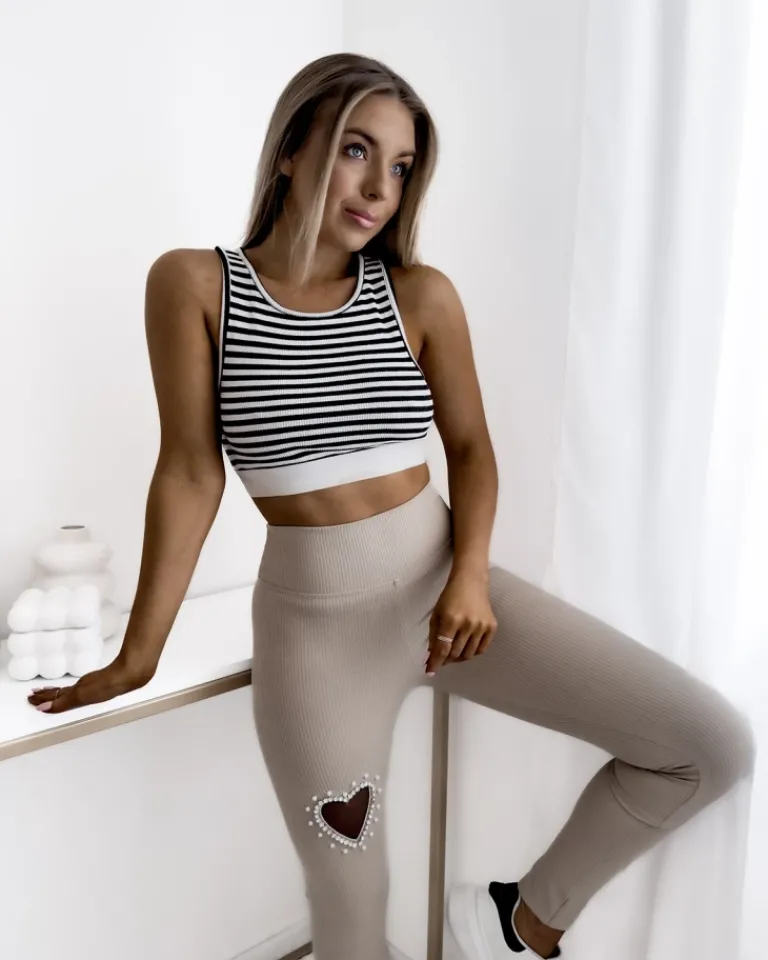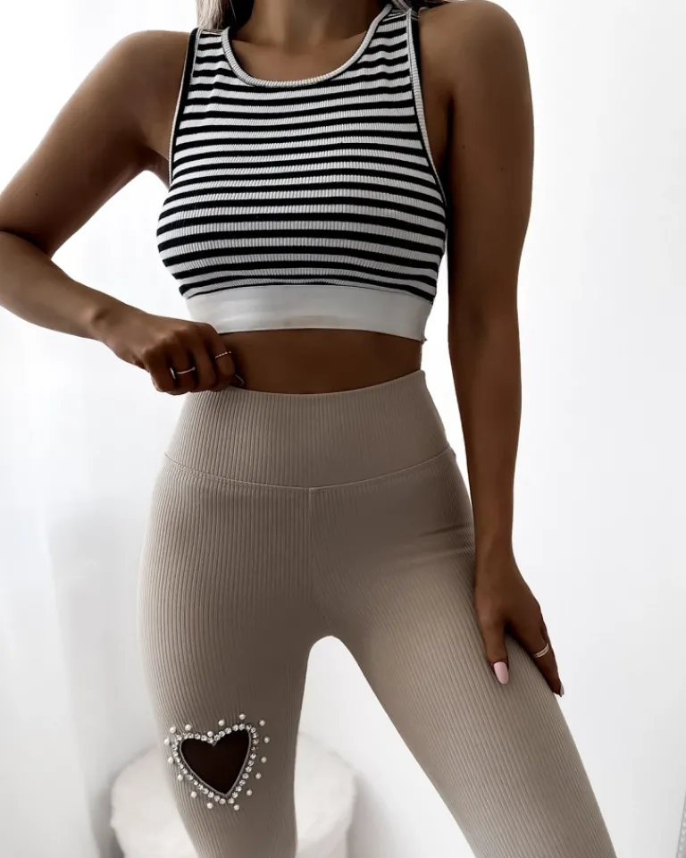 - Damskie legginsy z elastycznego materiału prążkowanego. Na nogawce serduszko z siateczką i kryształkami, które dodaje charakteru i wyróżnia się na tle klasycznych legginsów. UWAGA: Dokładność pomiaru (+/-) 1 cm.