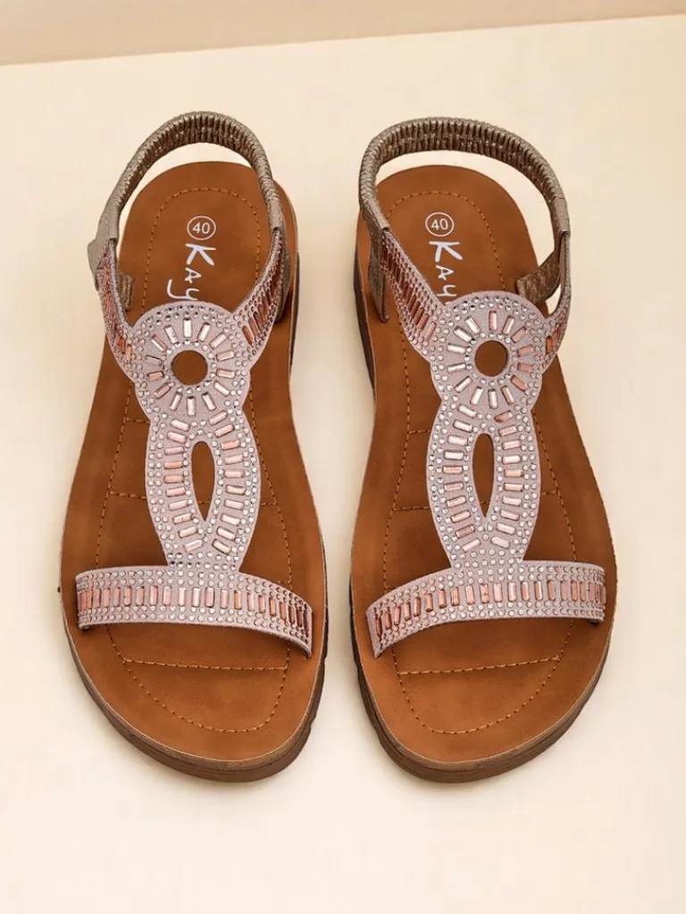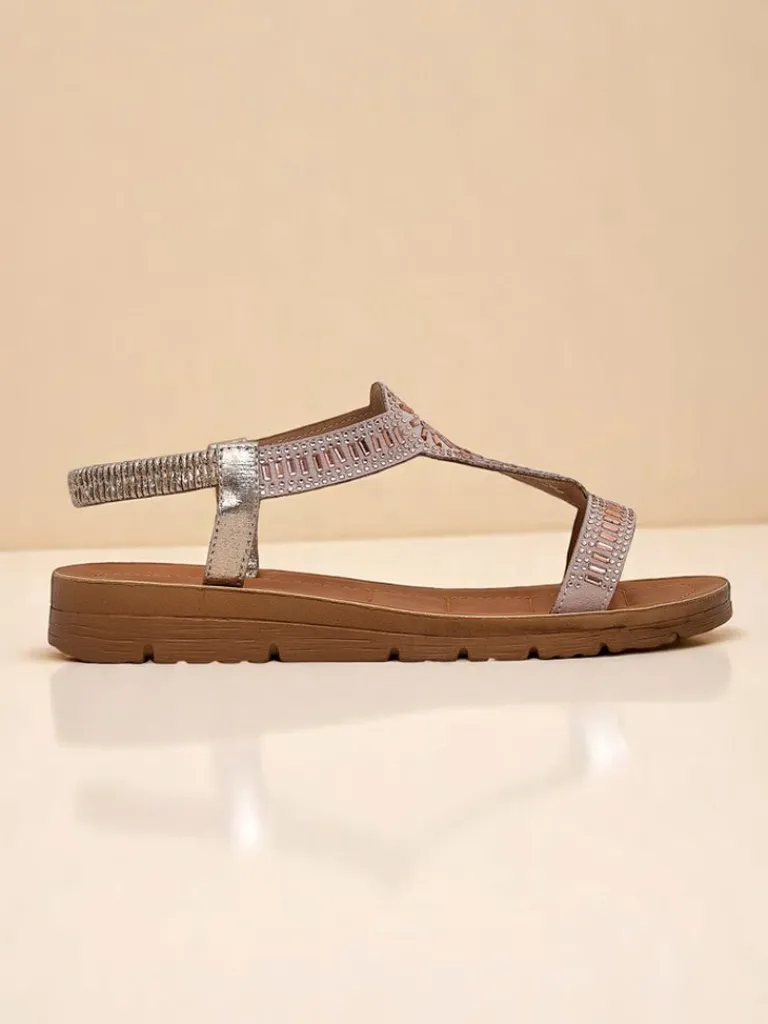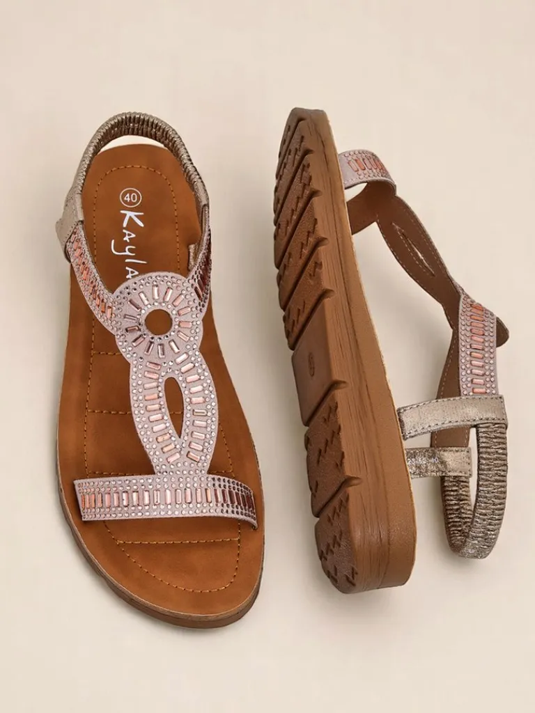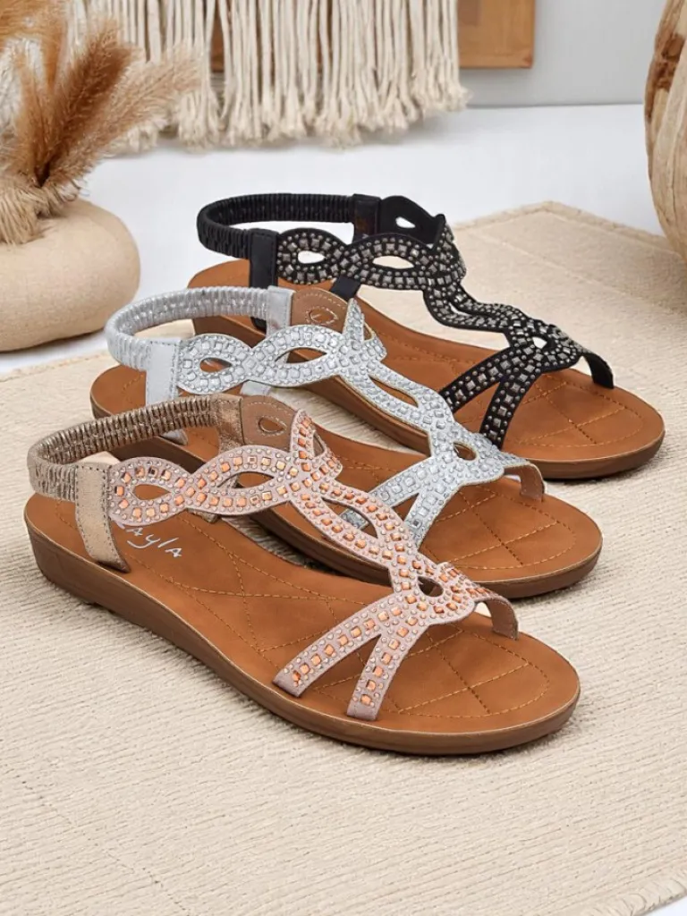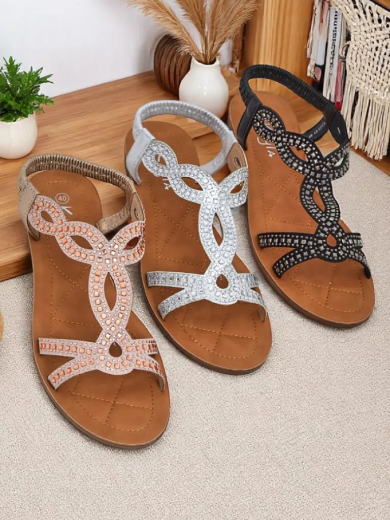 - Sandały damskie na płaskiej podeszwie z eko skóry, zdobione paseczkami z cyrkoniami. Połączenie wygody i subtelnego blasku, idealne na letnie dni i wieczorne wyjścia.