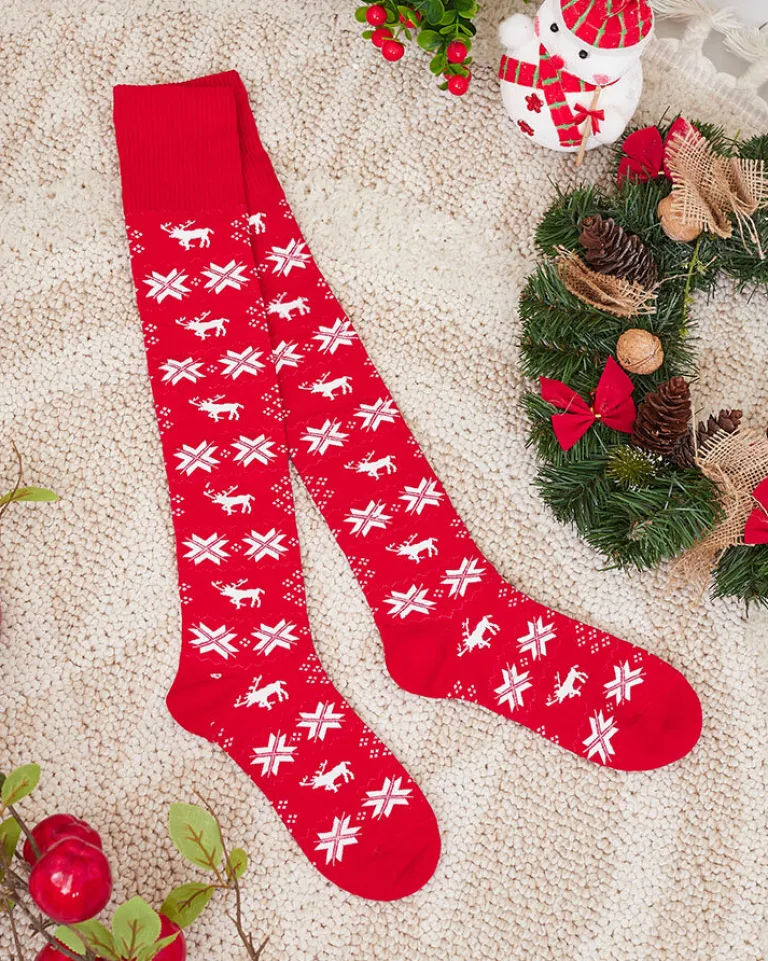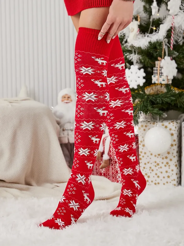 - Przeurocze damskie skarpety za kolano, wykonane z elastycznej tkaniny bawełnianej wykończonej świątecznym wzorem. Ciepłe i wygodne – to doskonała propozycja na zimowe wieczory!