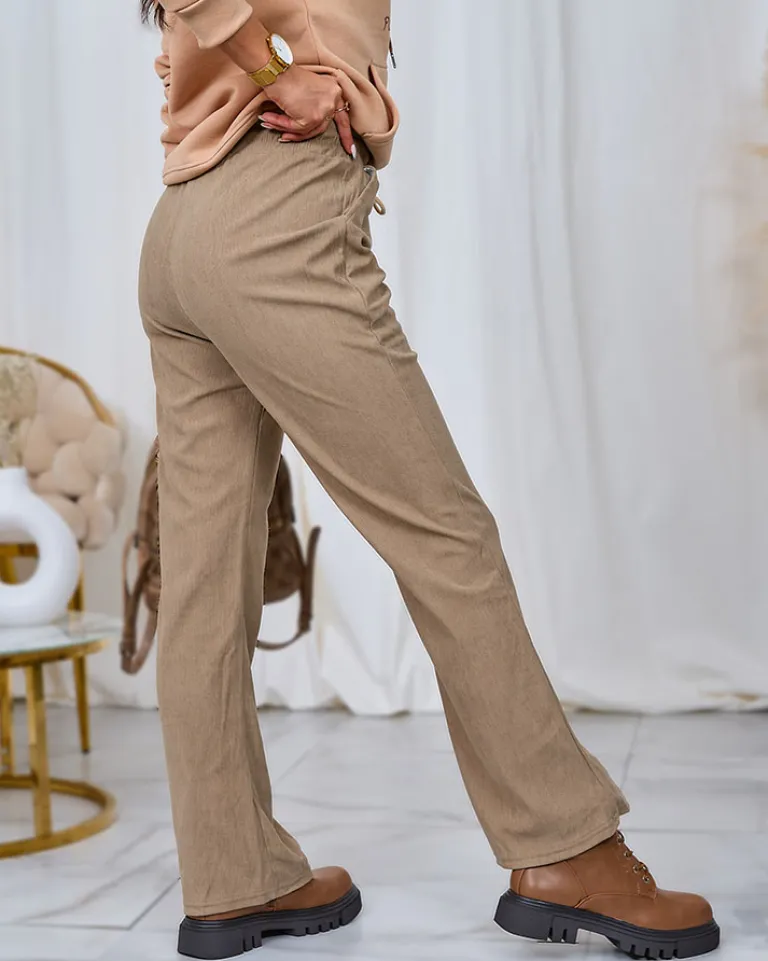 - Mega stylowe szerokie spodnie materiałowe wykonane z miękkiej tkaniny sztruksowej. Elastyczna guma w pasie z regulowanymi troczkami pozwala na dostosowanie spodni do swojego indywidualnego kształtu. Dodatkowo, dwie wsuwane kieszenie z przodu.