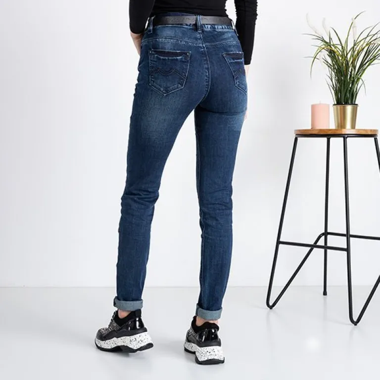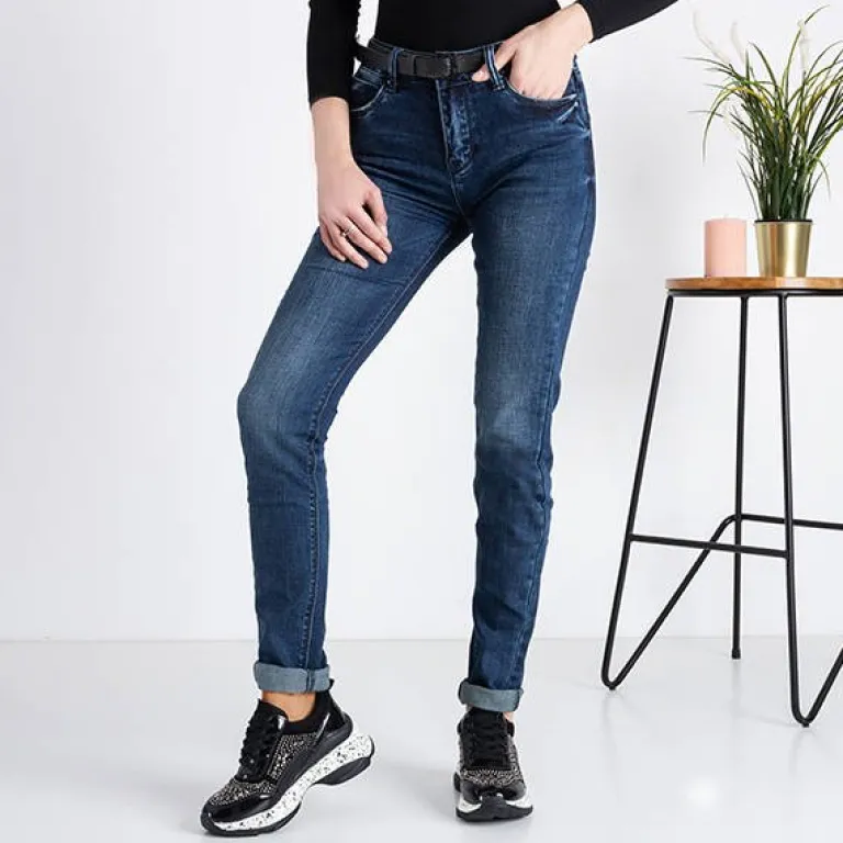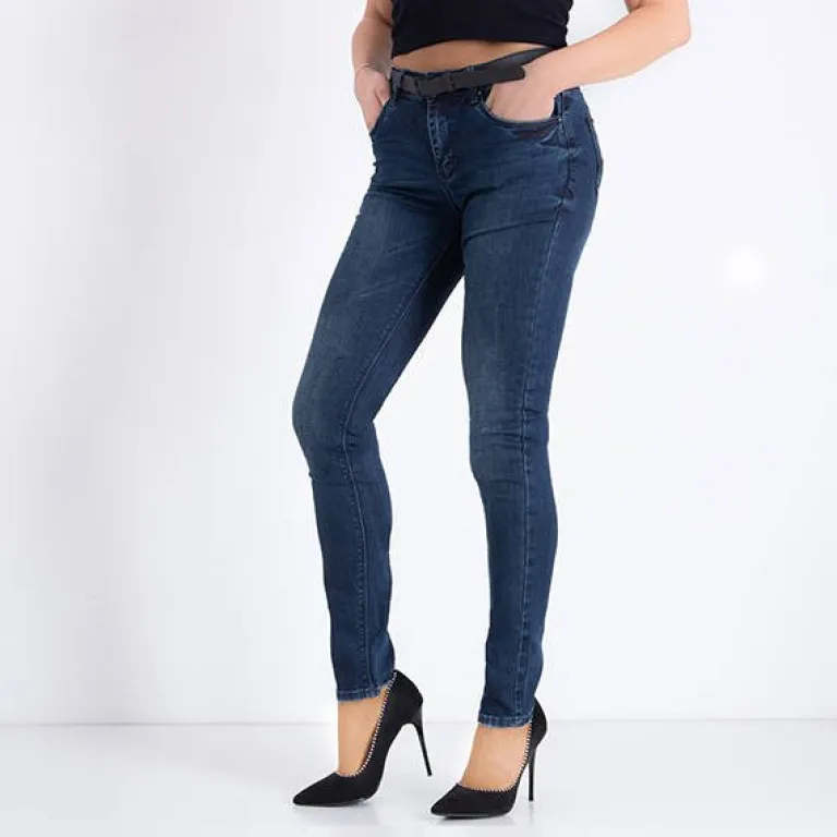 - Granatowe jeansy typu rurki. Model wykonany z rozciągliwej tkaniny bawełnianej. Spodnie z wysokim stanem, z przodu oraz z tyłu wsuwane kieszonki. Zapinane suwakiem oraz na guzik. Do spodni dołączono pasek. UWAGA: Dokładność pomiaru (+/-) 1 cm.