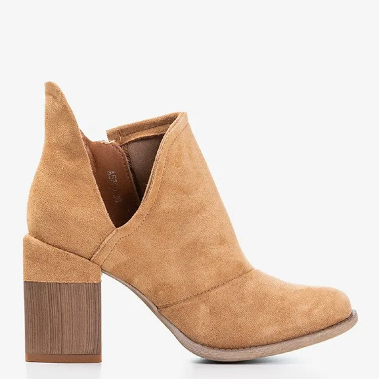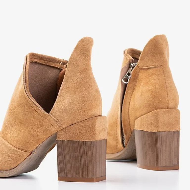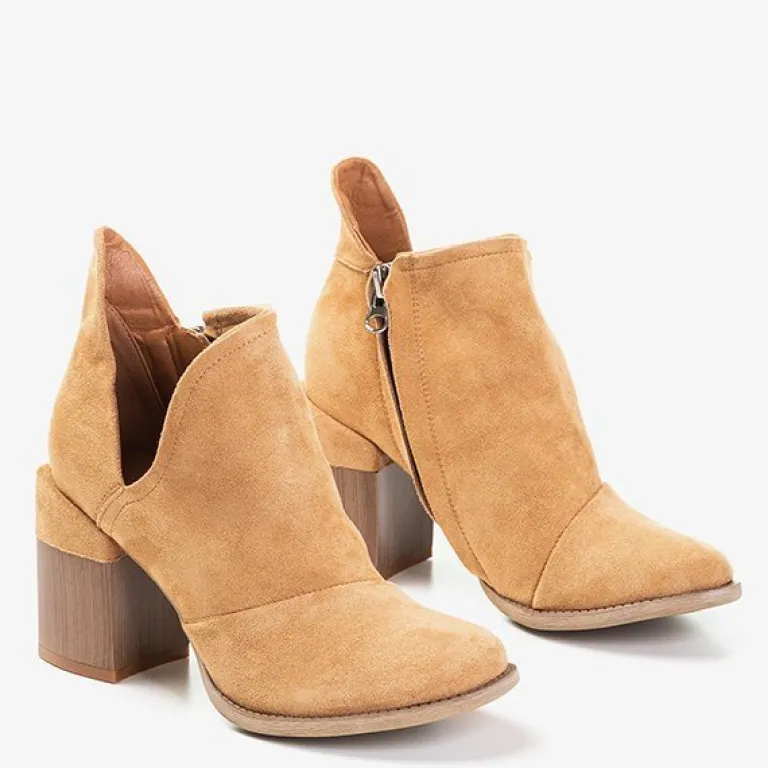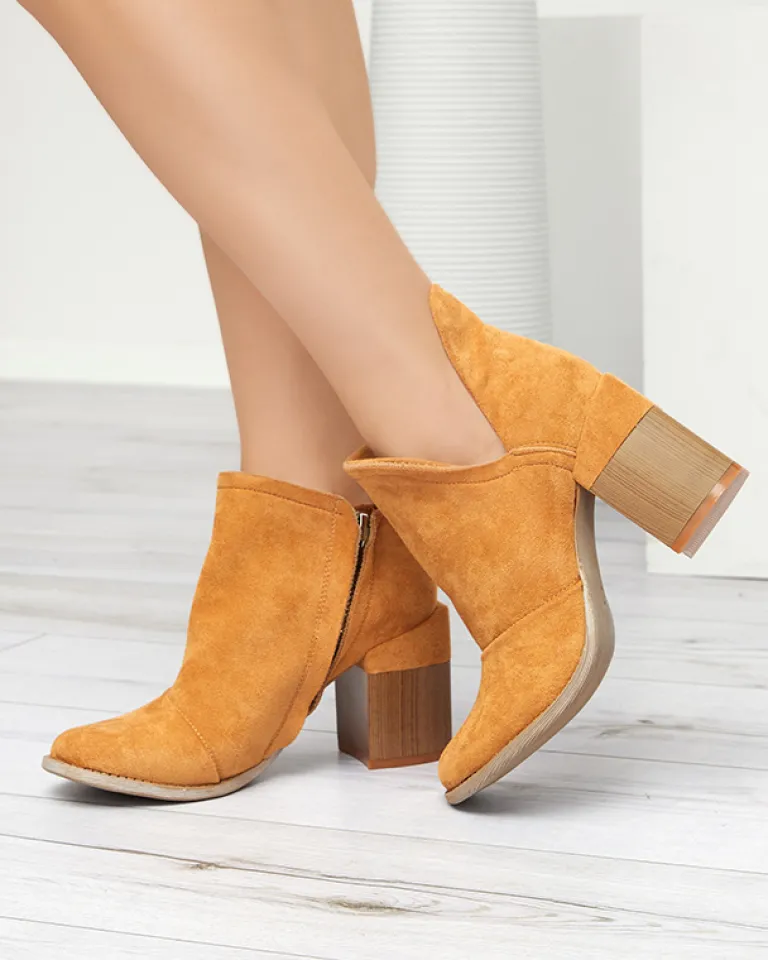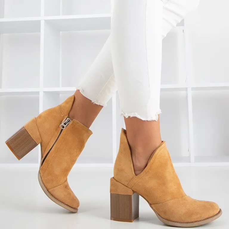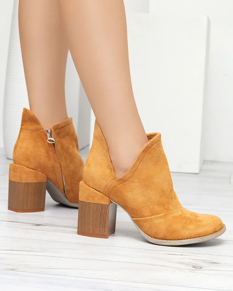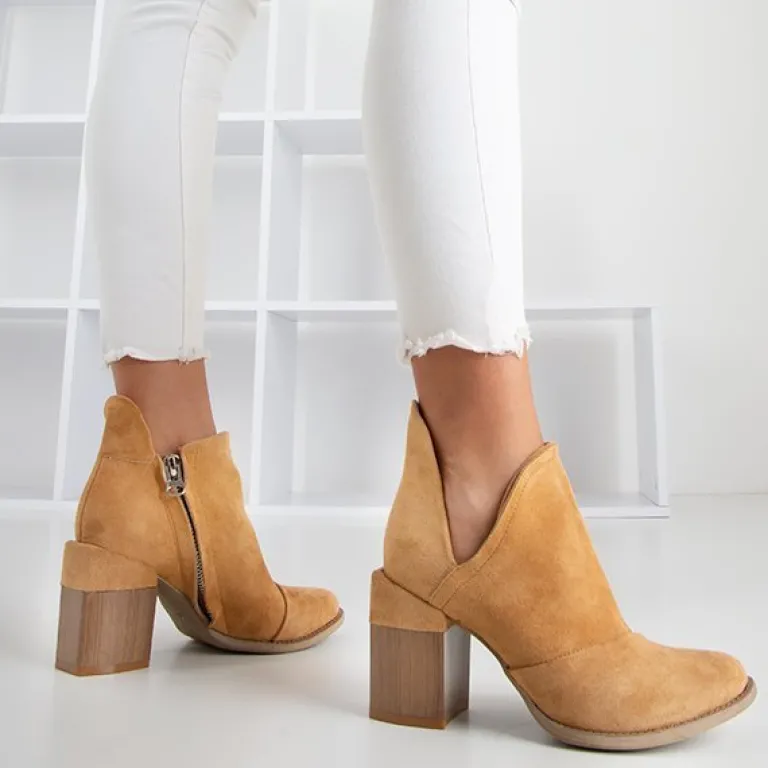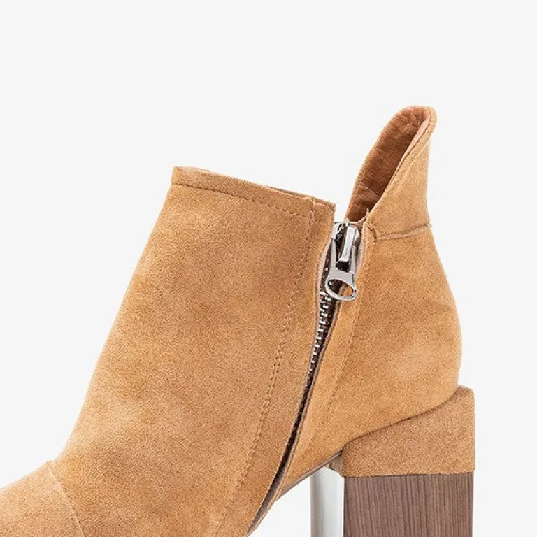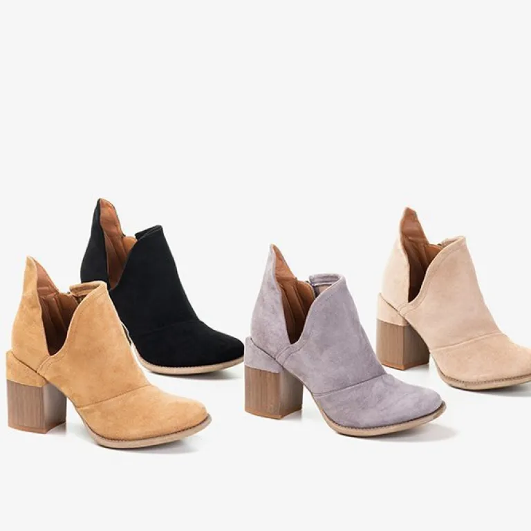- Oryginalne damskie botki na słupku z okrągłym noskiem. Materiał wykonania to eko-skóra zamszowa, w środku eko-skórzana wkładka. Cholewka zapinana suwakiem, po boku posiada wycięcia. Idealny dodatek do jesiennych stylizacji.