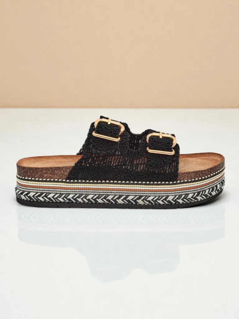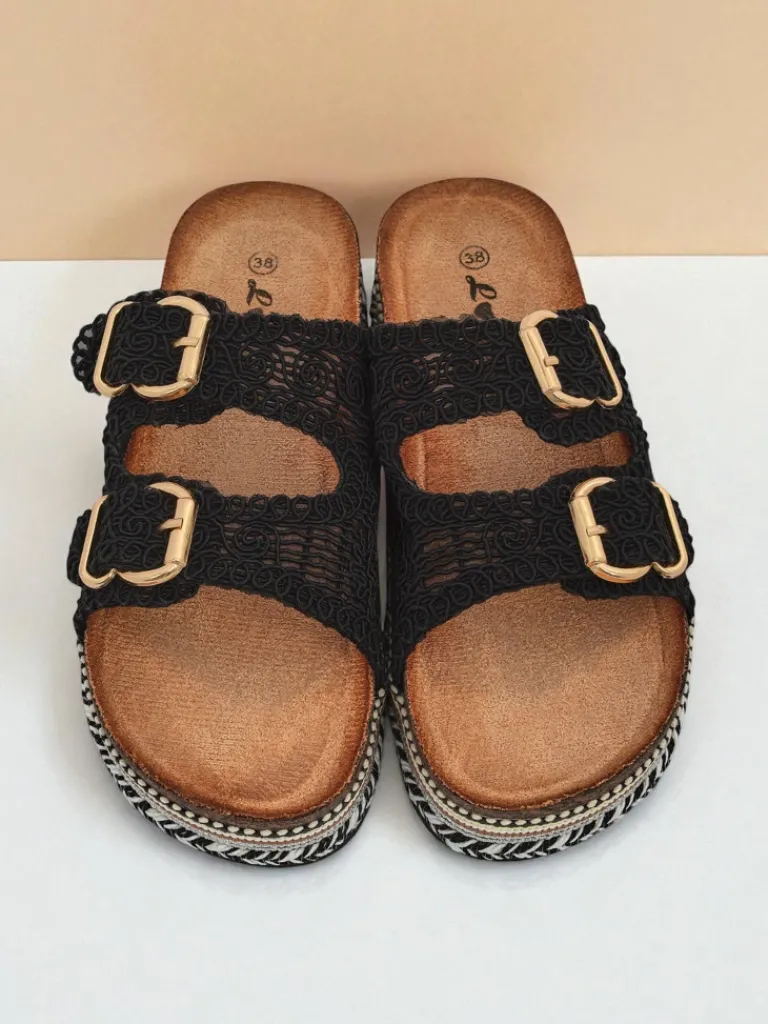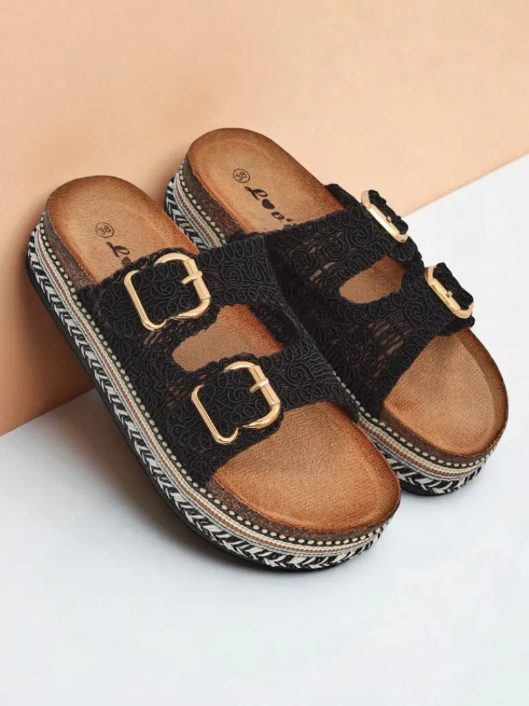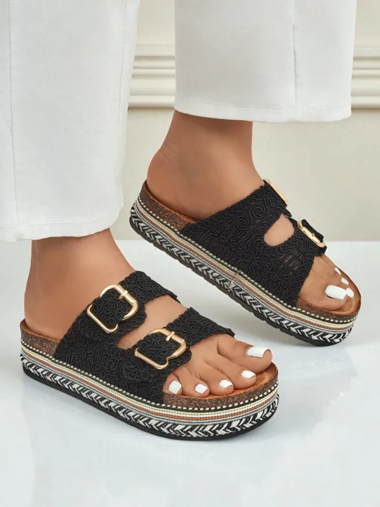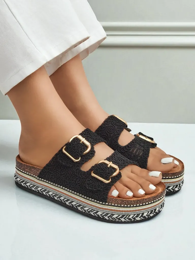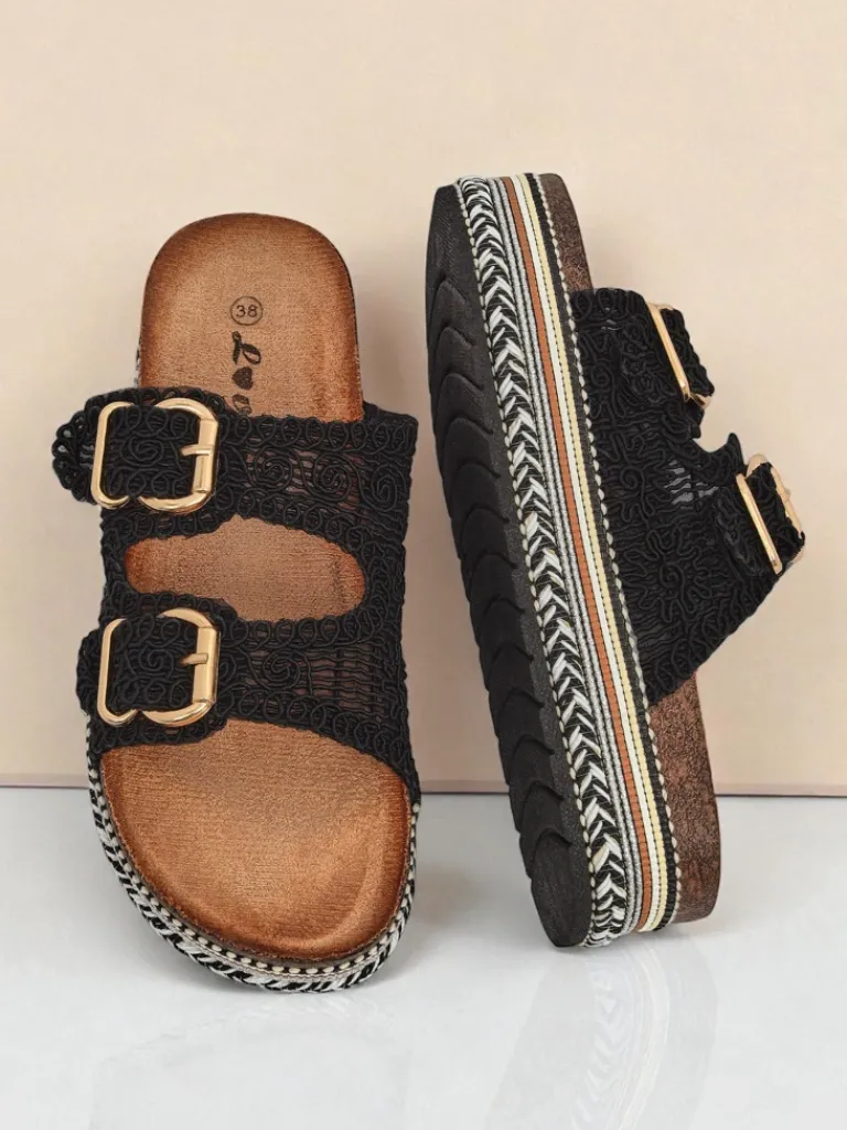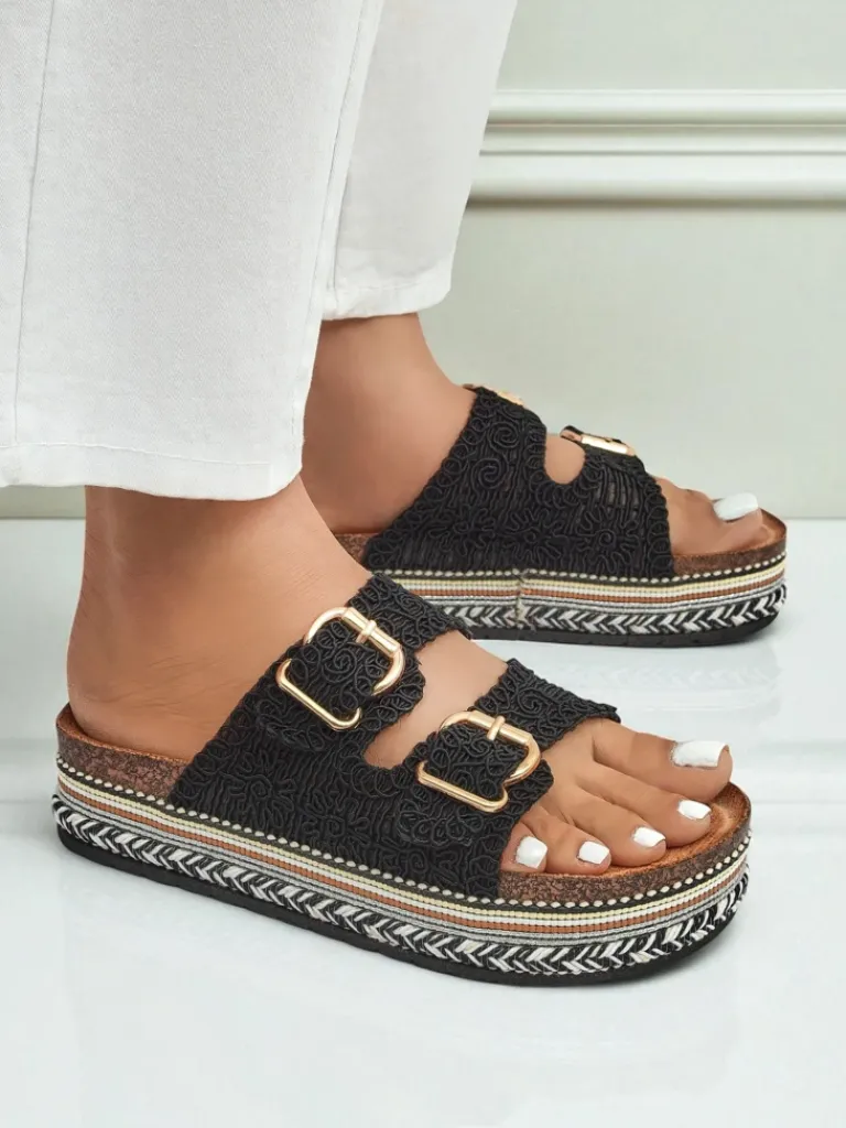 - Stylowe klapki na platformie à la korek, z plecionymi tkaninowymi paseczkami zdobionymi klamerkami. Wygodna eko zamszowa wkładka zapewnia komfort, a błyszczące detale dodają elegancji letnim stylizacjom.