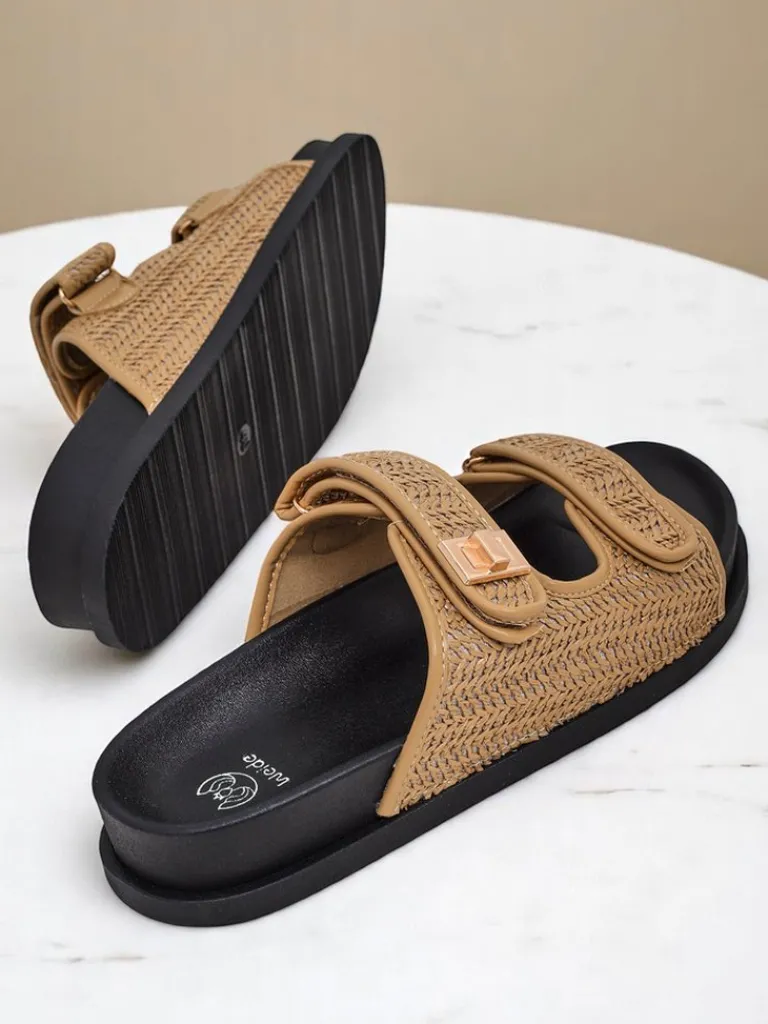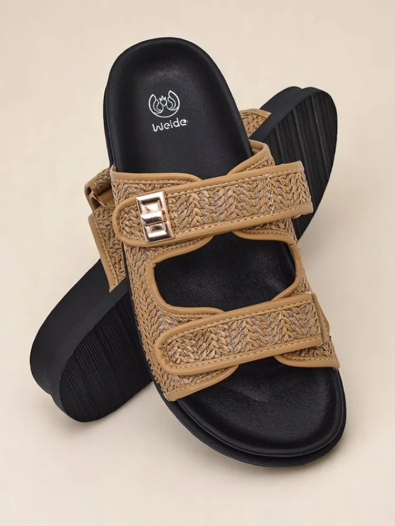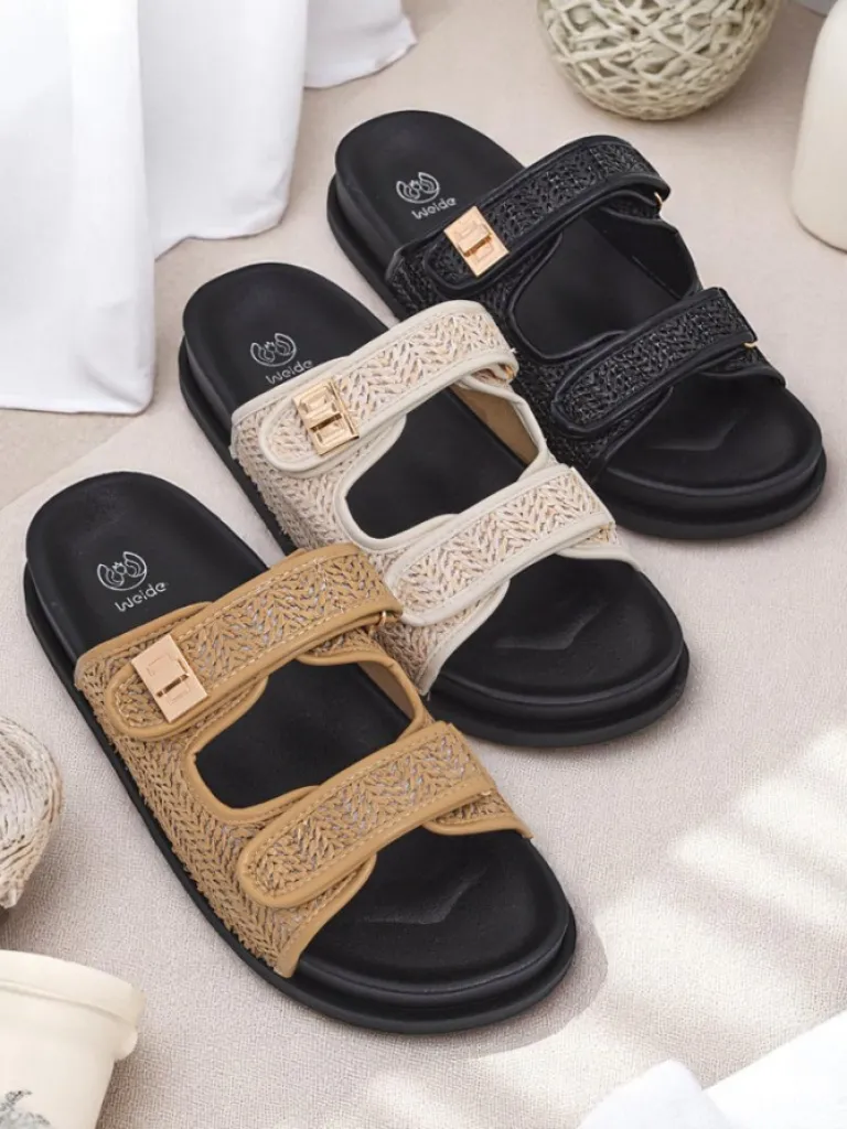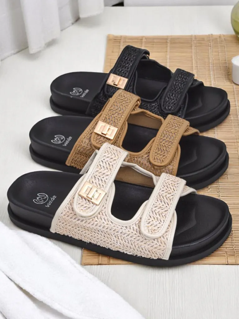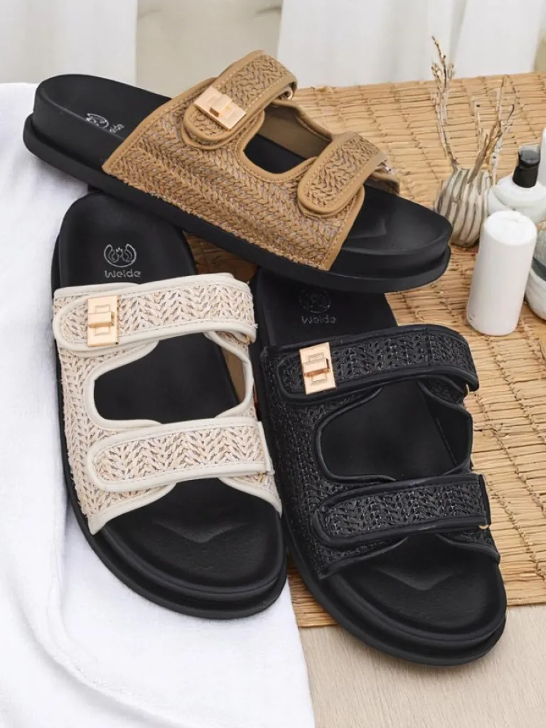- Przepiękne klapki damskie wykonane z tkaniny słomianej zdobione plastikowymi klamerkami. Gumowa podeszwa. Model posiada regulację na rzepy. Idealnie uzupełnią letnie stylizacje!