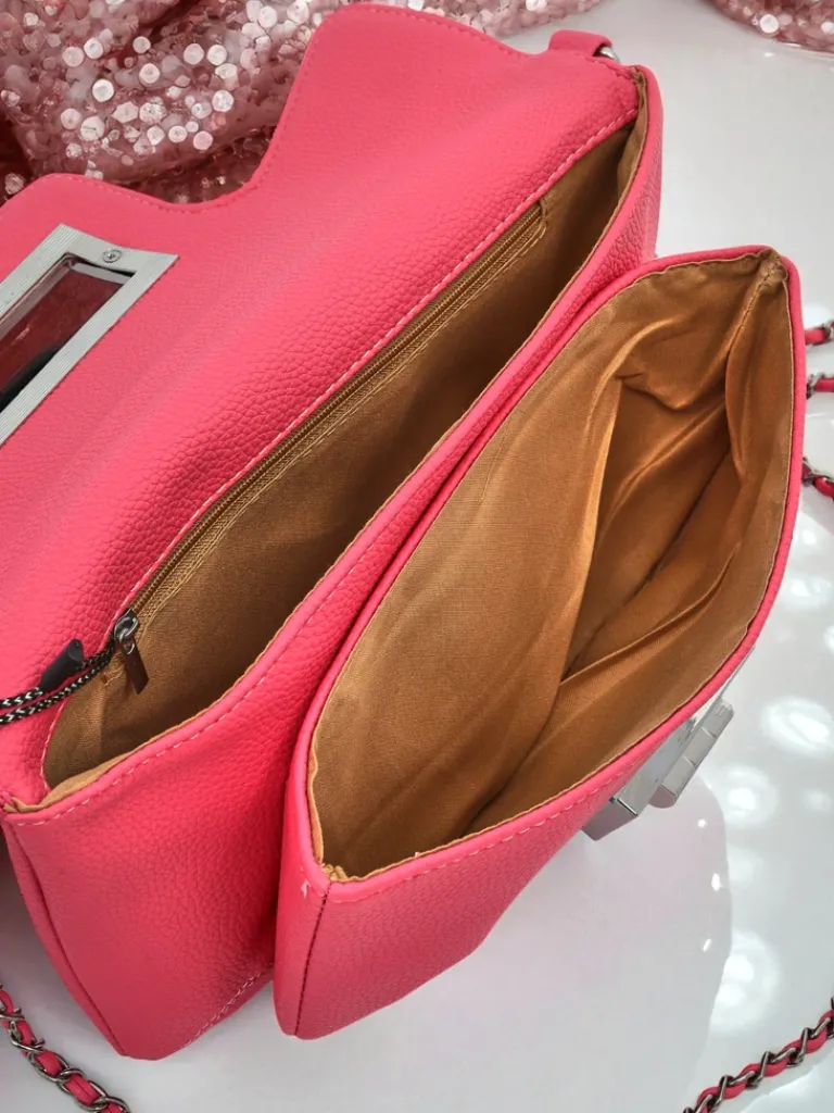 - Elegancka mała torebka damska kopertowa z eko skóry. Model z zapięciem na zamek i magnes, posiada 1 komorę. Dodatkowo regulowany pasek z łańcuszka. Idealna na oficjalne wyjścia!