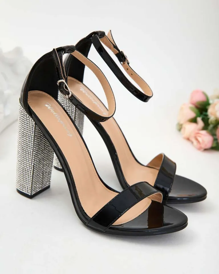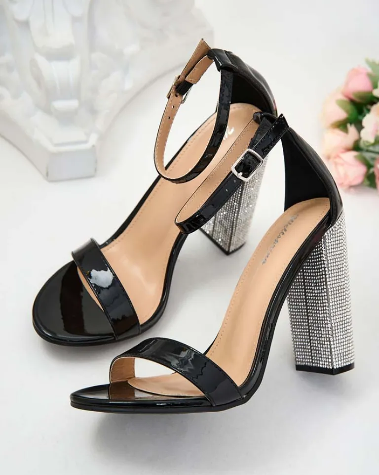 - Sandałki ze skóry ekologicznej lakierowanej na wysokim słupku, zapinane na sprzączkę. Mieszanka stylu i wygody. Solidny obcas pokryty cyrkoniami nadaje pewności kroku. Doskonałe na każdą okazję!