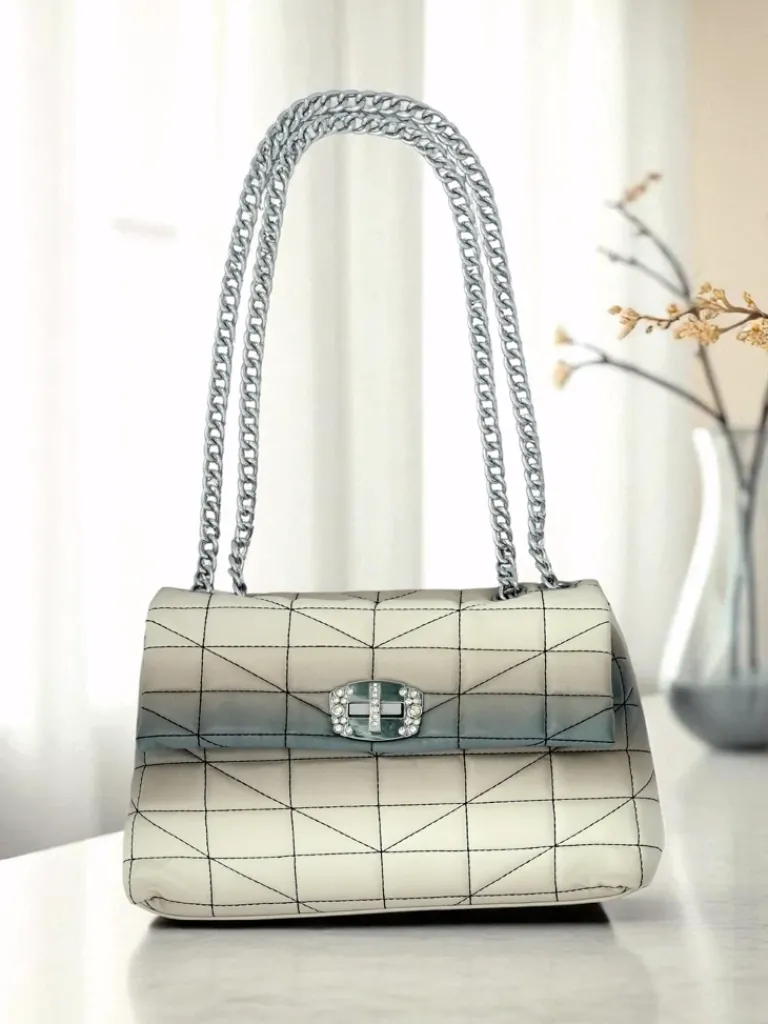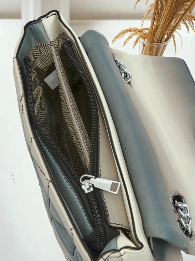 - Elegancka kopertowa torebka z eko skóry z efektem ombre. Zamykana na zamek i zatrzask. Metalowy łańcuszek zamiast paska dodaje szyku. 1 komora idealna na najważniejsze rzeczy na wieczór i specjalne okazje.