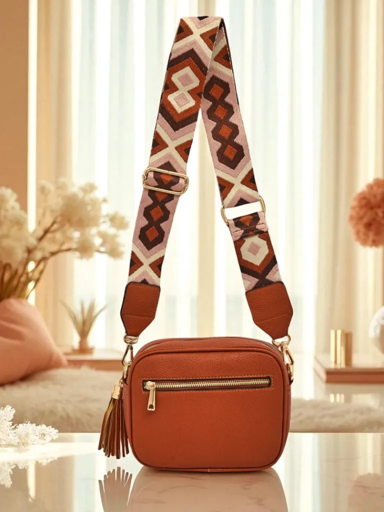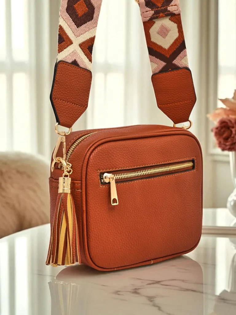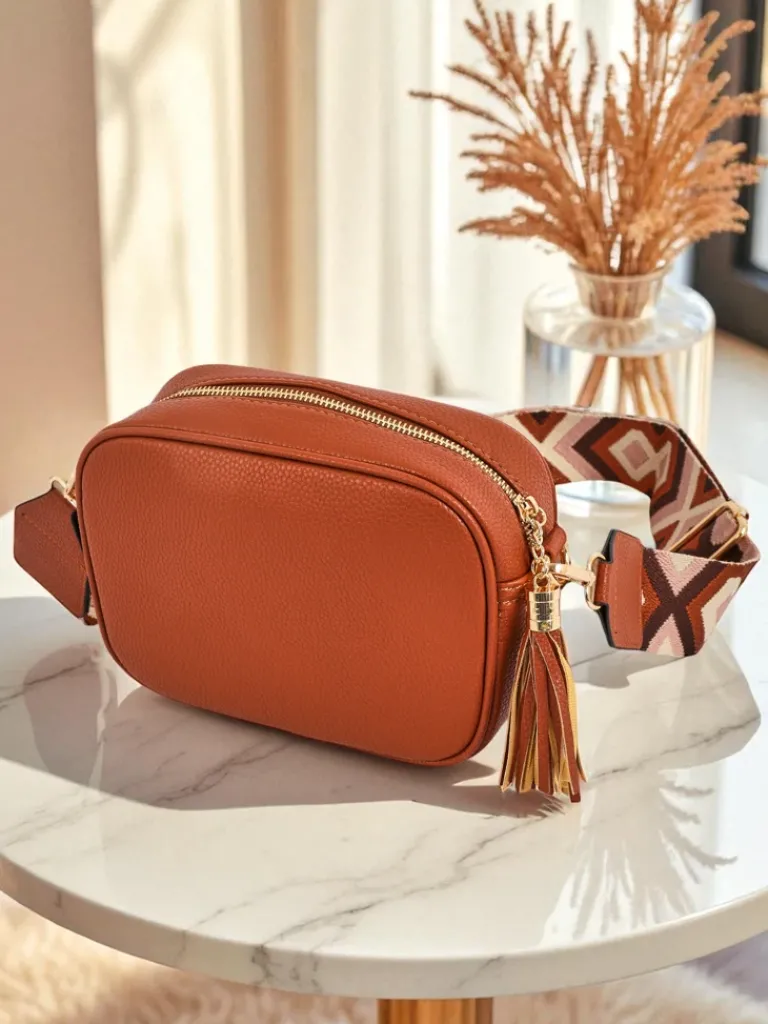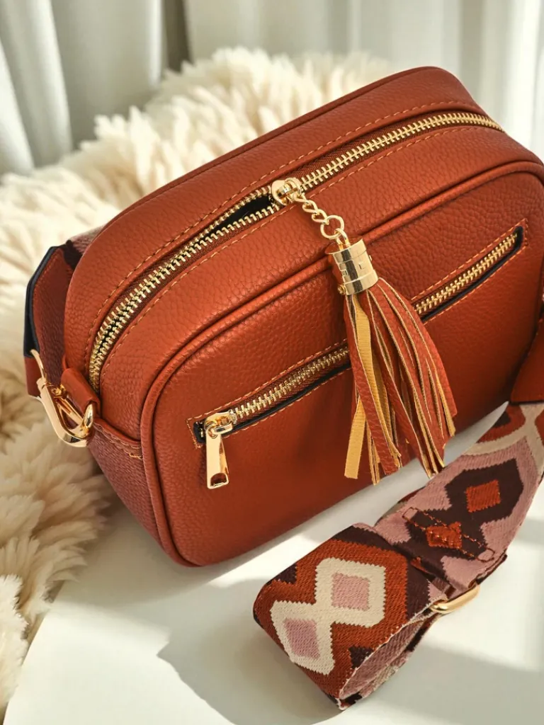 - Stylowa mała torebka z eko skóry z kolorowym paskiem i uroczym frędzelkiem. 1 komora, 2 kieszonki, regulowany i odpinany pasek. Idealna na co dzień i na wyjścia – kompaktowa, a pomieści wszystko, co ważne.