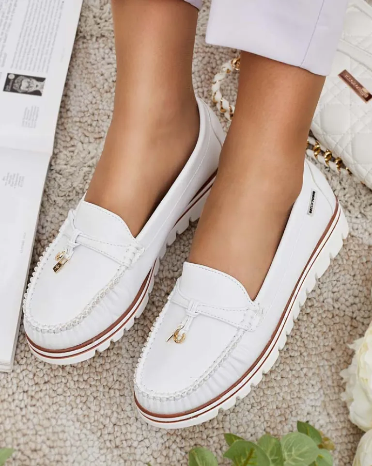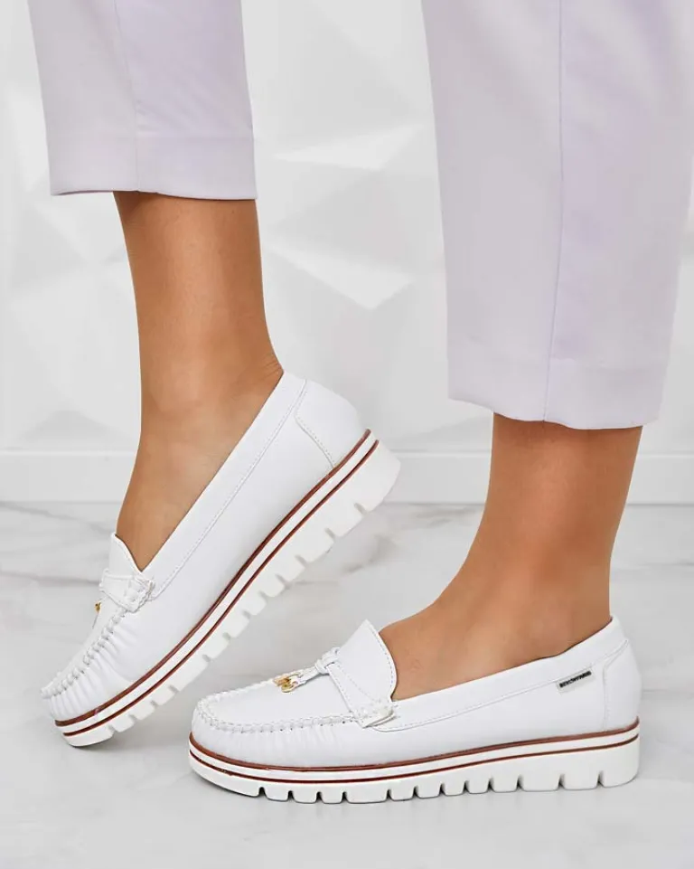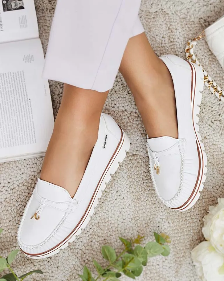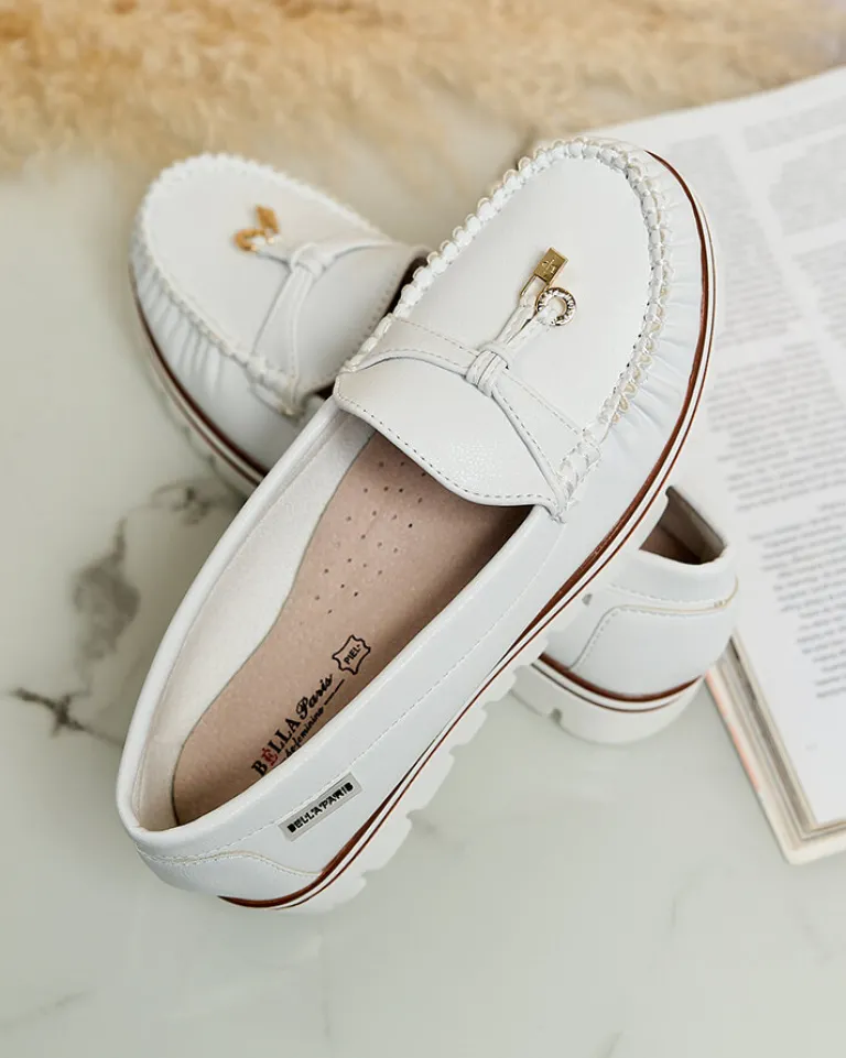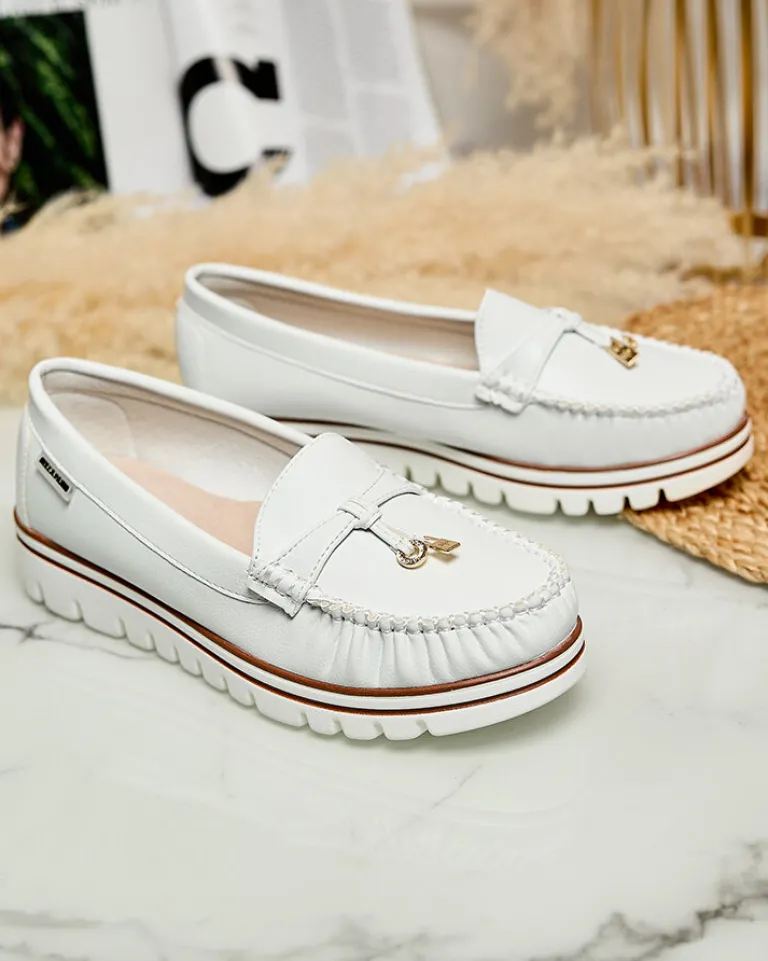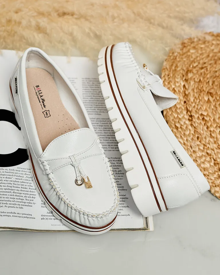 - Casualowe damskie mokasyny na płaskiej podeszwie. Model jest wykonany ze skóry ekologicznej, wkładka to skóra naturalna. Idealna baza na co dzień!