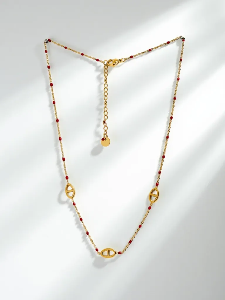 - Złocony naszyjnik Perla Aurelia – elegancka biżuteria z czerwonymi koralikami do stylizacji na każdą okazję.