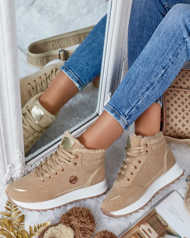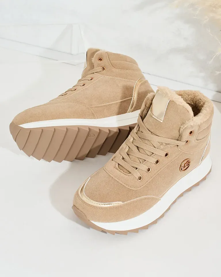 - Sportowe sneakersy damskie na grubszej podeszwie. Cholewka sznurowana, wykonana z nubuku ekologicznego. Wnętrze w całości ocieplone futerkiem. Idealne do sportowych outfitów!