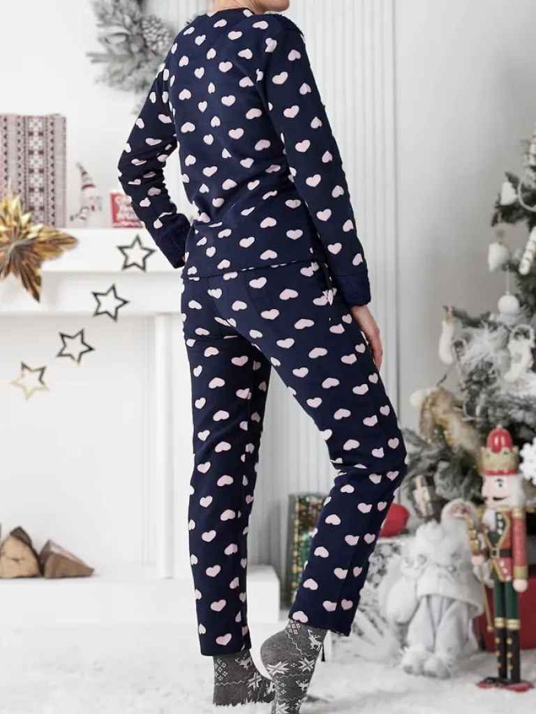- Piżama damska 2-częściowa z długim rękawem i długimi nogawkami, wykonana z materiału a’la polar. Model zdobiony printem. Idealna na domowe wieczory! UWAGA: Dokładność pomiaru (+/-) 1 cm.