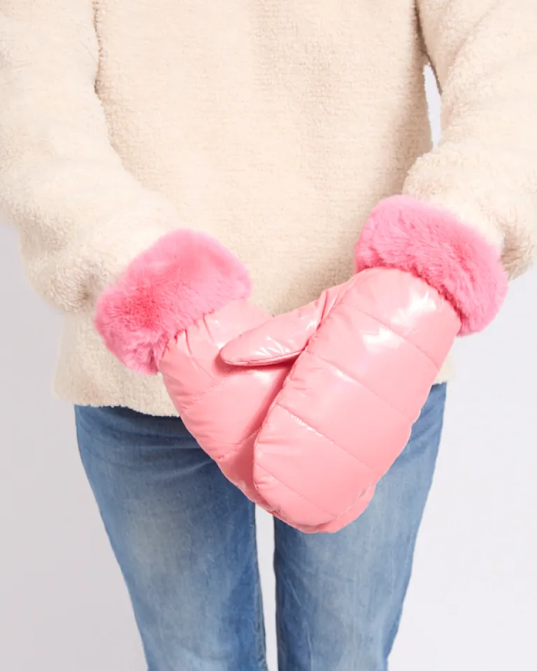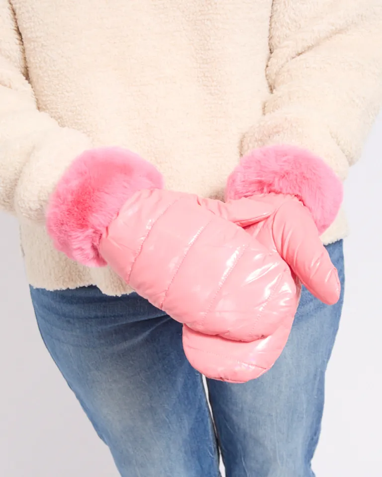 - Cieplutkie rękawiczki wykonane z materiału a’la cerata, wewnątrz miękka, futrzana podszewka, w dolnej części również futerko. Idealne na mroźne dni!