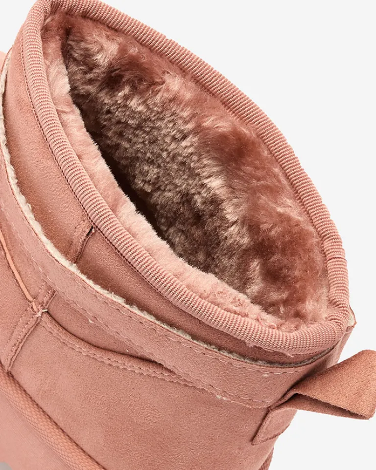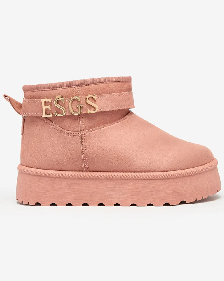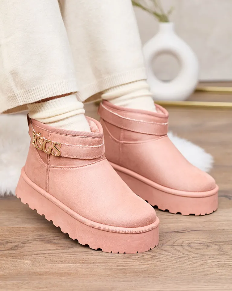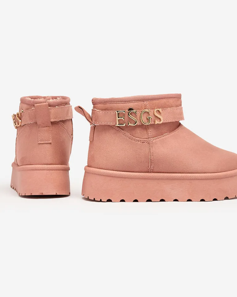 - Mega stylowe damskie ocieplane śniegowce wykonane ze skóry ekologicznej zamszowej. Posiadają środek wypełniony futerkiem a’la kożuszek. Dodatkowo zdejmowany paseczek zdobiony napisem. Buty na wysokiej platformie – idealne do zimowych casualowych outfitów