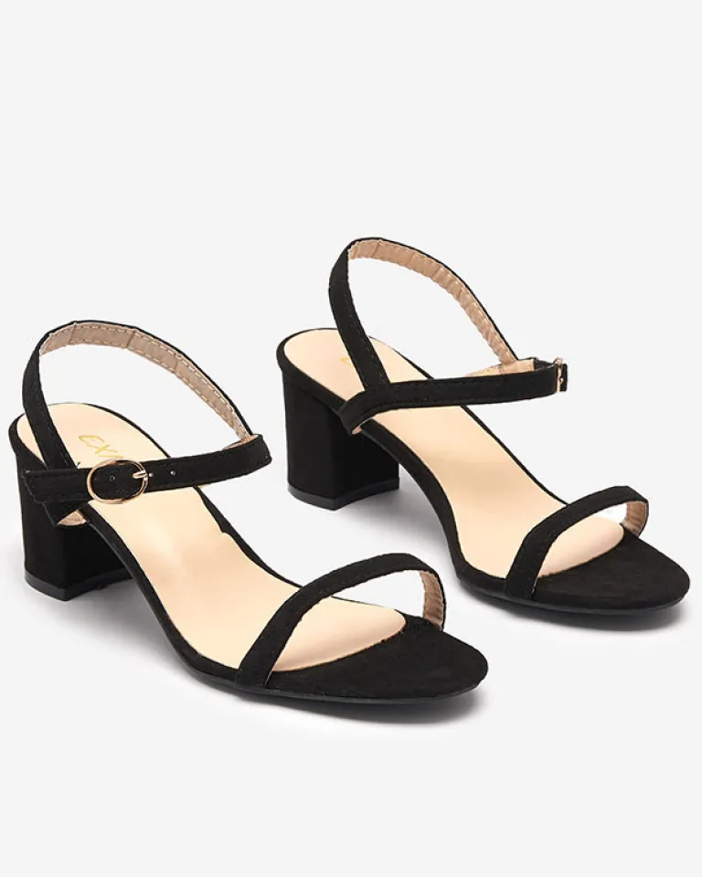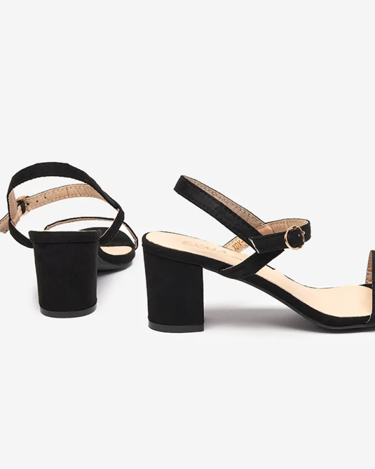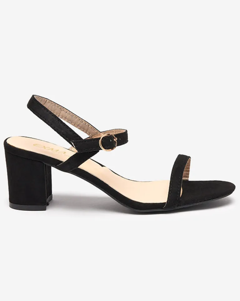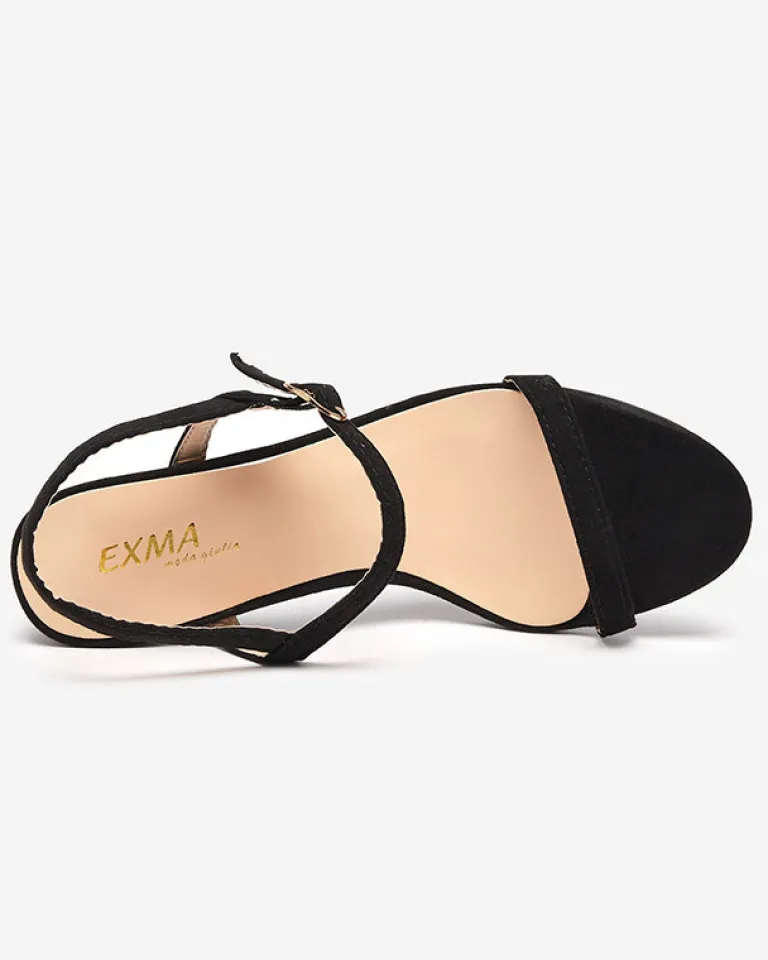 - Klasyczne damskie sandały na stabilnym słupku, wykonane ze skóry ekologicznej zamszowej. Model zapinany na sprzączkę, w środku posiada eko skórzaną wkładkę. Super dodatek do Twoich sukienek i spódnic!